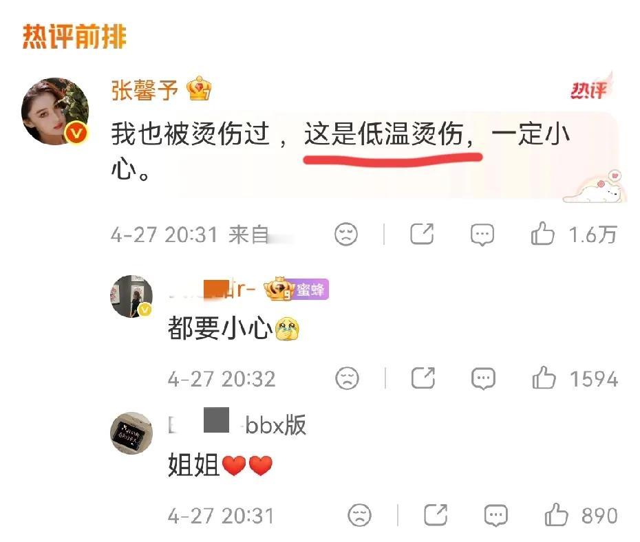 心疼杨幂一分钟,2月27日,杨幂在社交平台分享的自己的照片,并配文:“蒸汽眼罩咬我!” 动态刚一发出,张馨予在下方留言,低温烫伤一定要小心,还说自己也被烫伤过,演员是靠脸蛋吃饭的,真的是心疼杨幂,希望快点恢复!