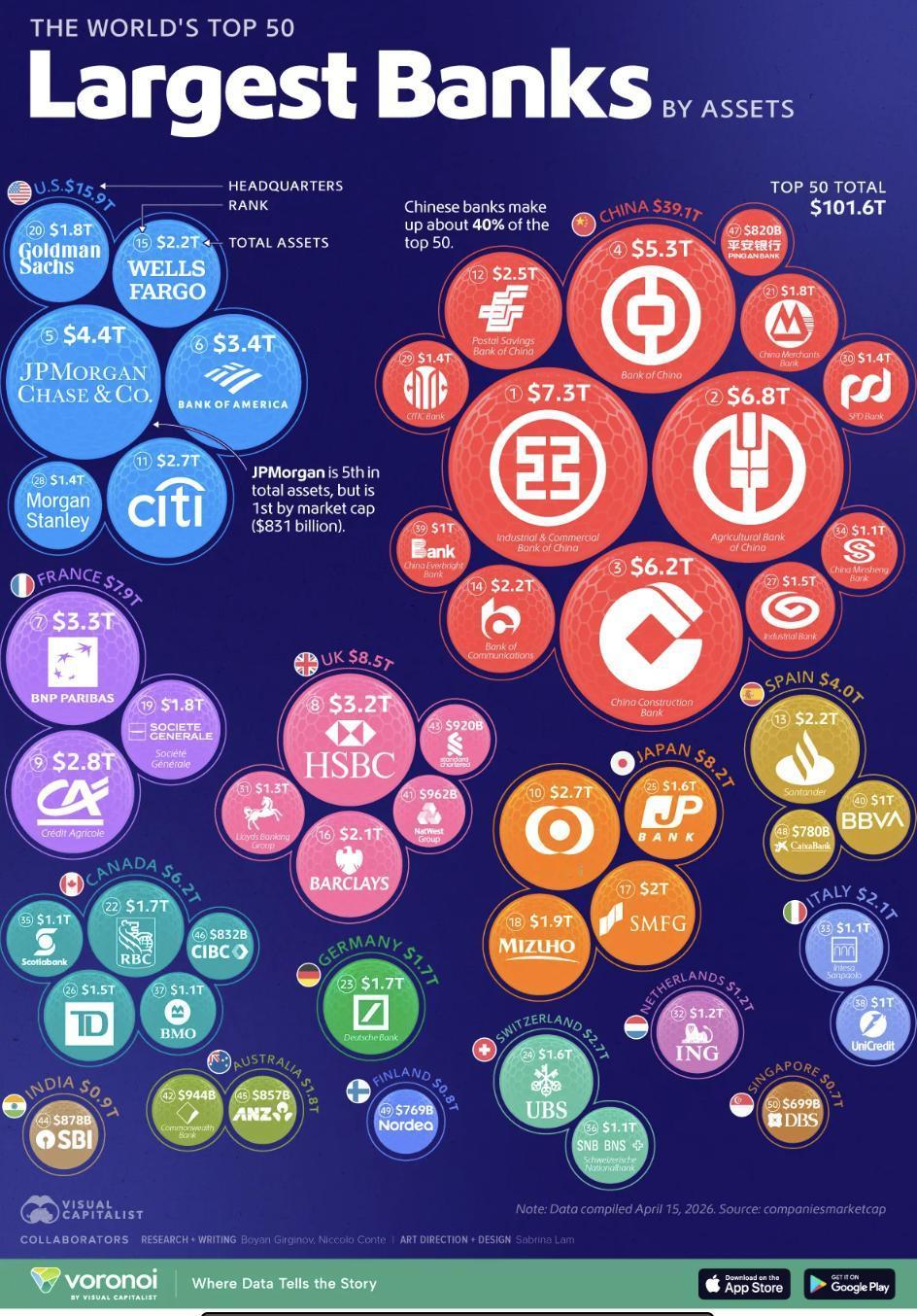 外媒:全球50大银行按资产排名:全球前50大银行总资产达101.6万亿美元,接近2025年全球111万亿美元的政府债务规模。