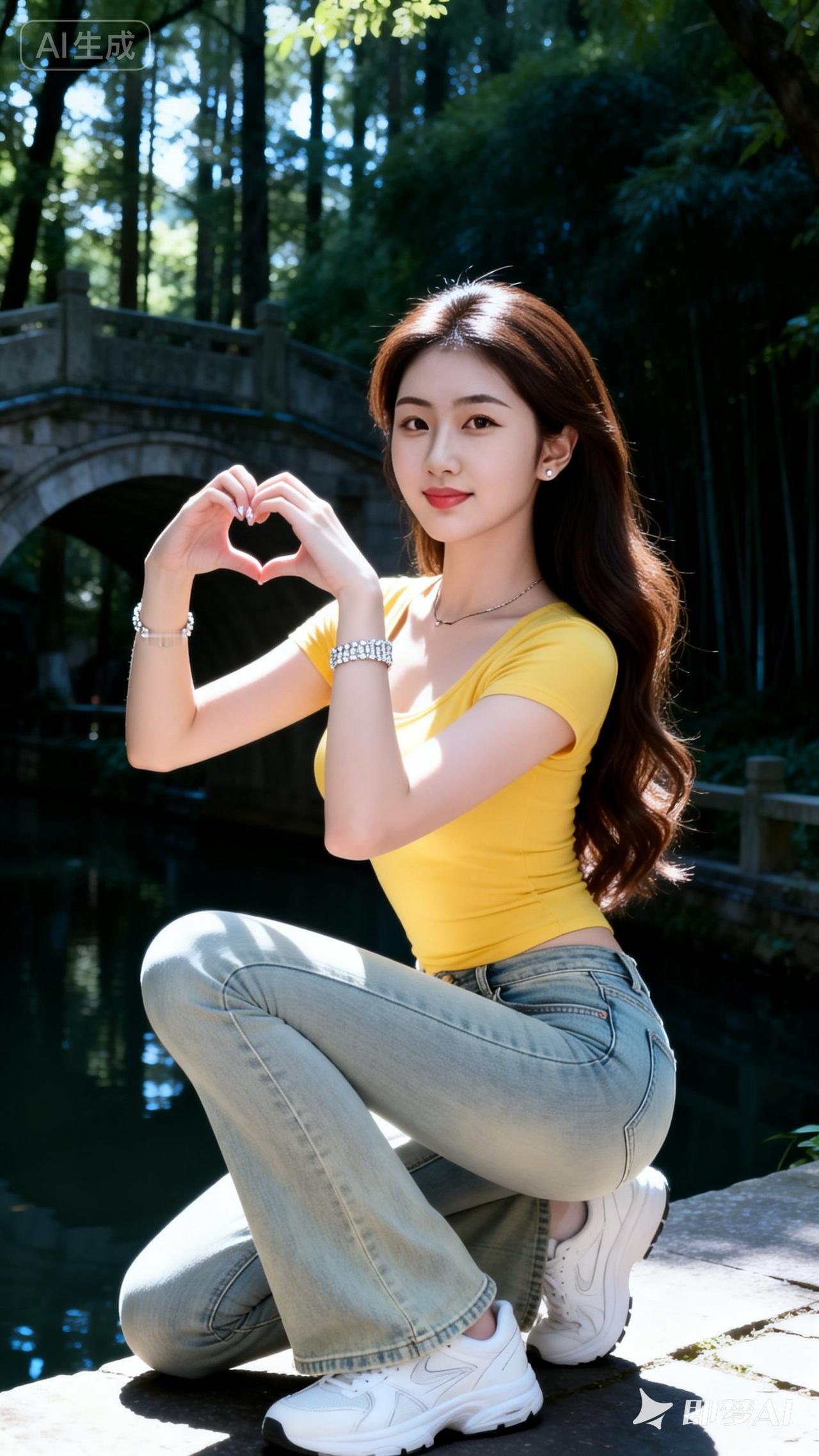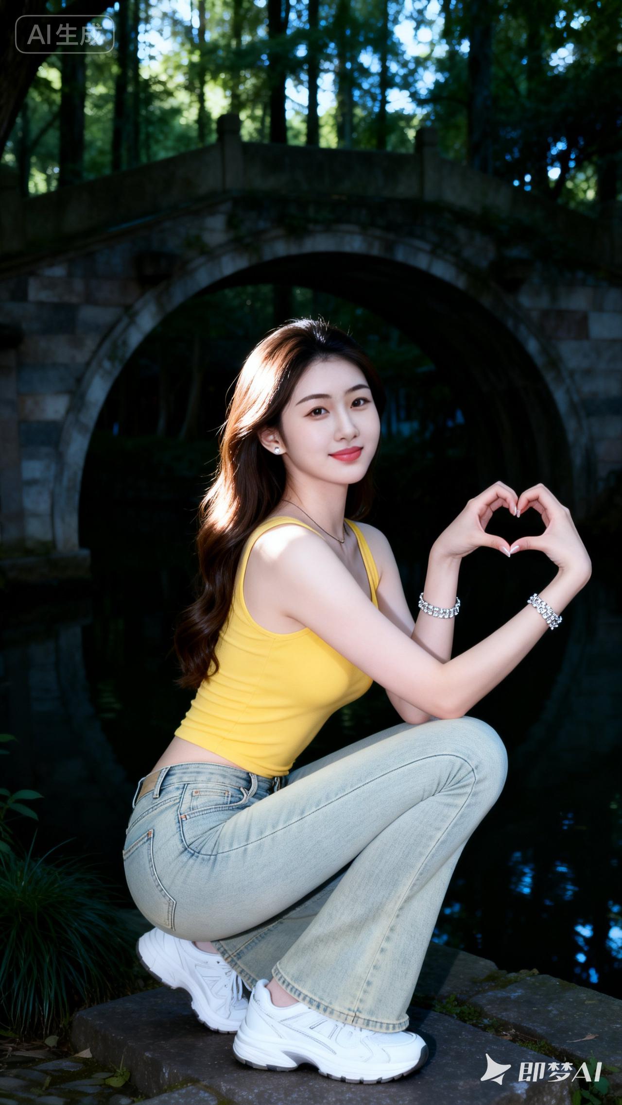 元气少女在公园桥下,微笑比心,阳光明媚,元气满满!🌞💖👩❤️👩