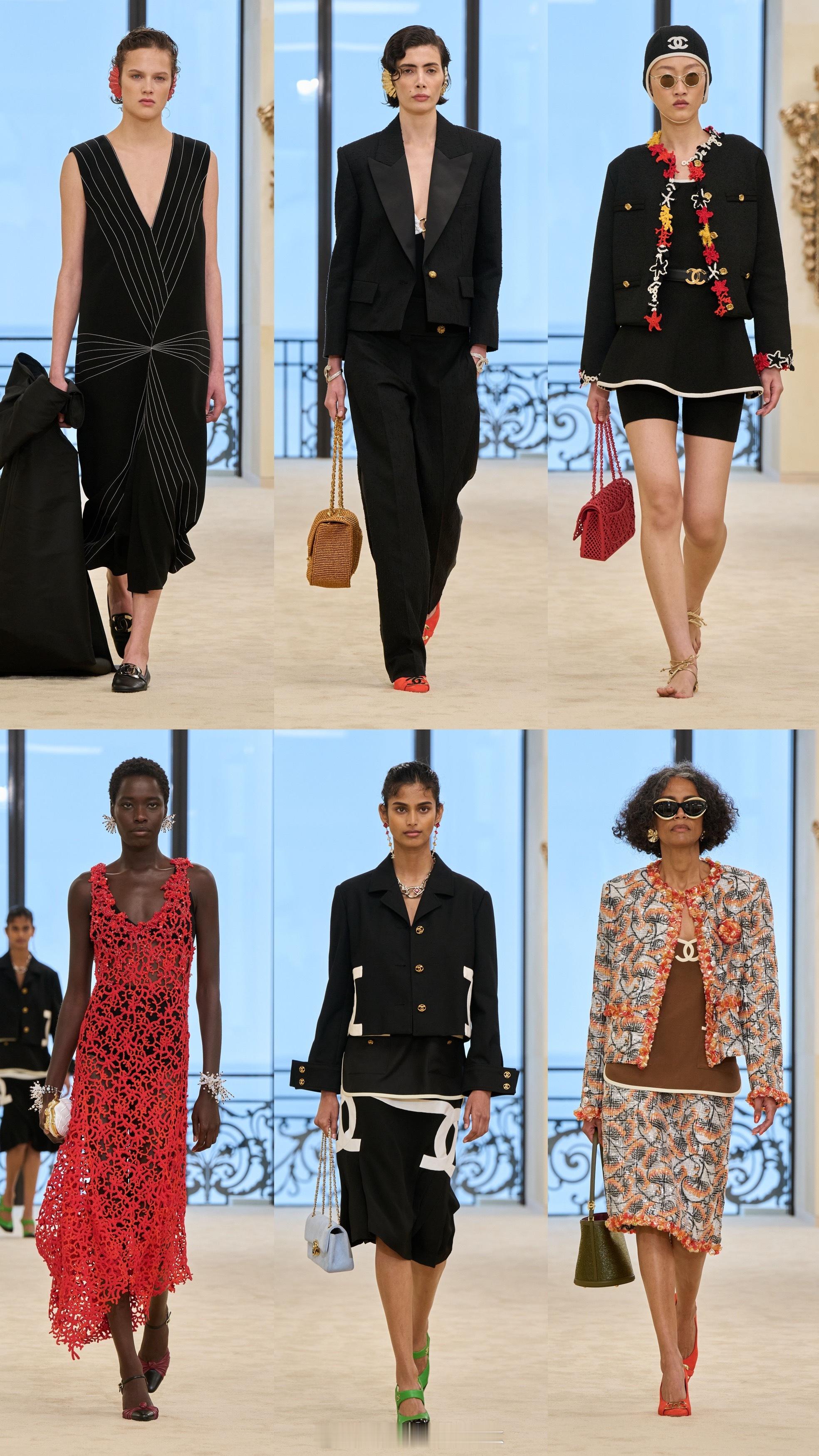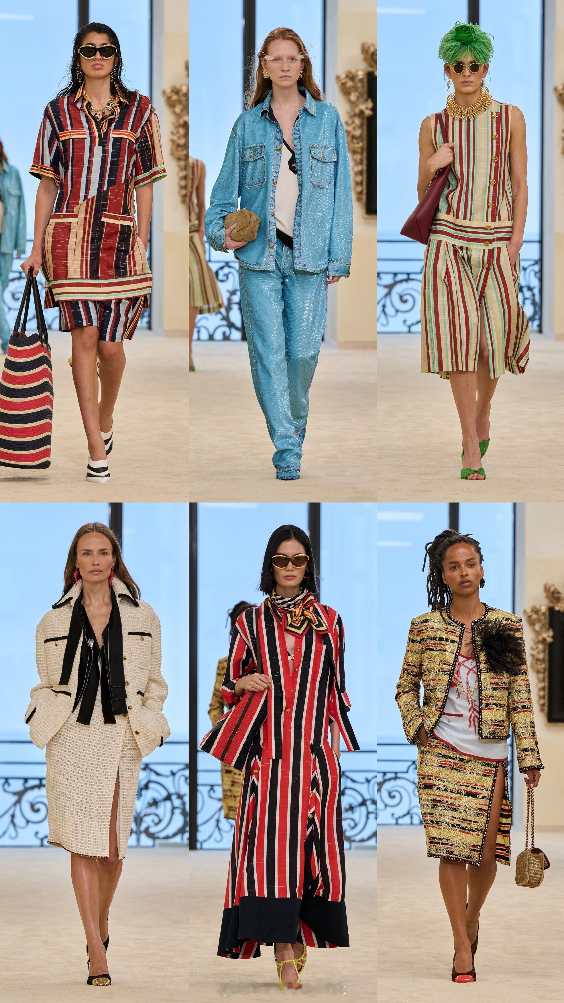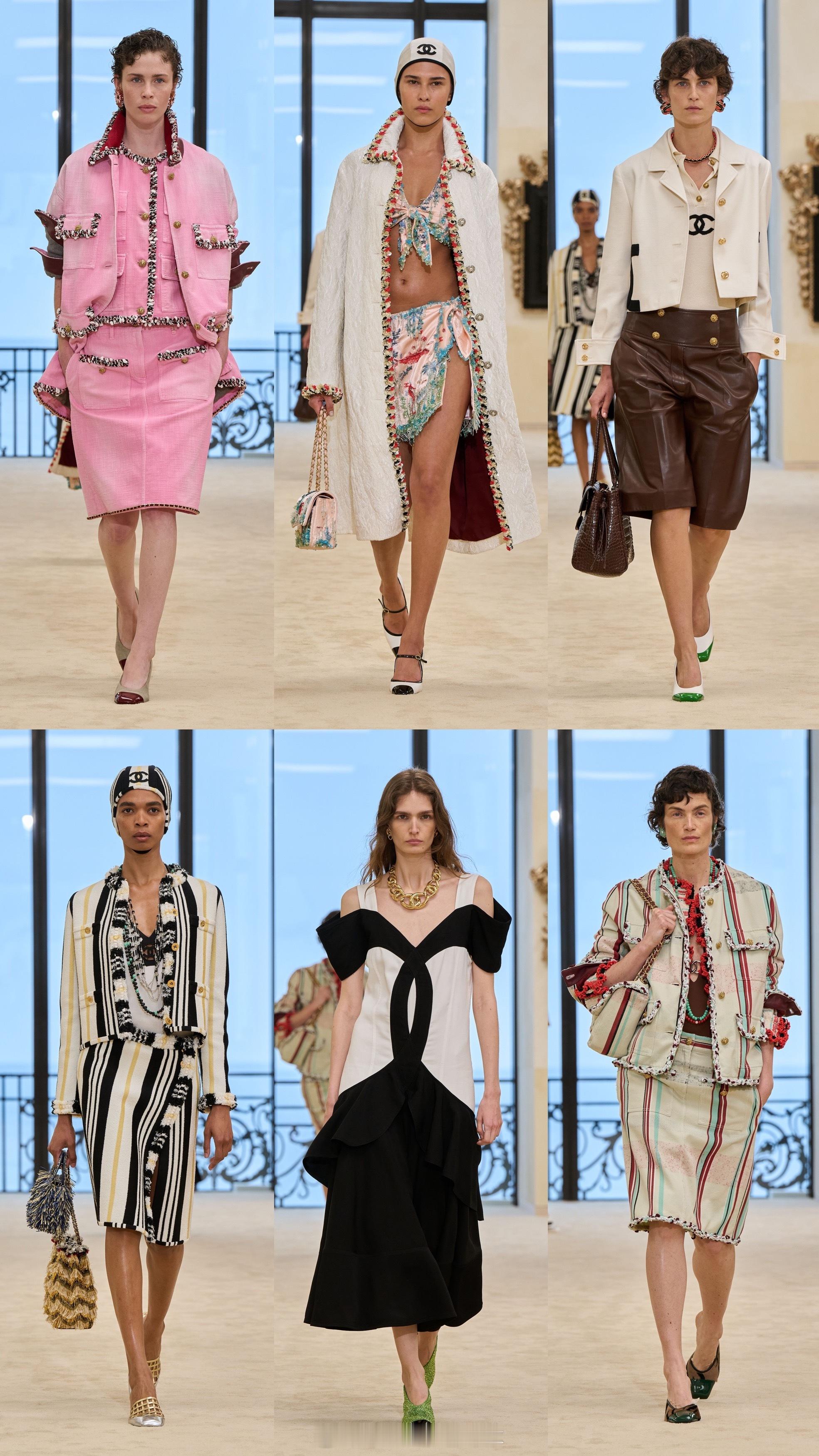 镜子、纯净线条、黑色与米色的对比,构成这一季的秀场视觉语汇。香奈儿2026/27早春度假系列79套造型以女性身体自由为题,将海洋风华美礼服交错共生。条纹图案、斜纹软呢与钉珠刺绣等元素构成整个系列的设计语汇。双C logo更是贯穿始终,化为服饰上的图案,完美延续度假美学。