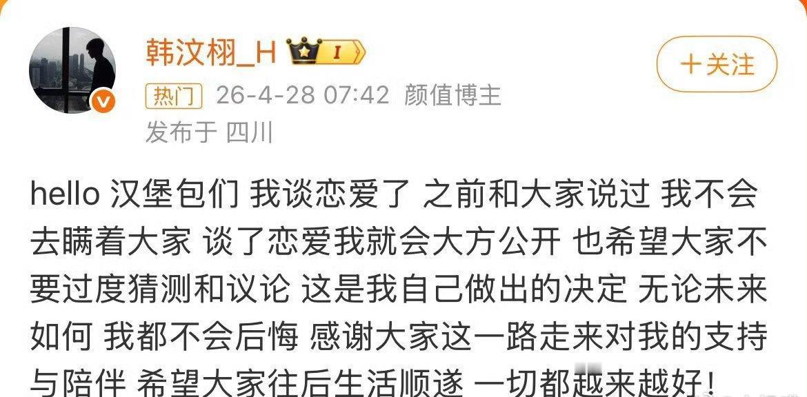 04.28 韩汶栩微博官宣恋爱,女友为圈外素人“苏晓妍”