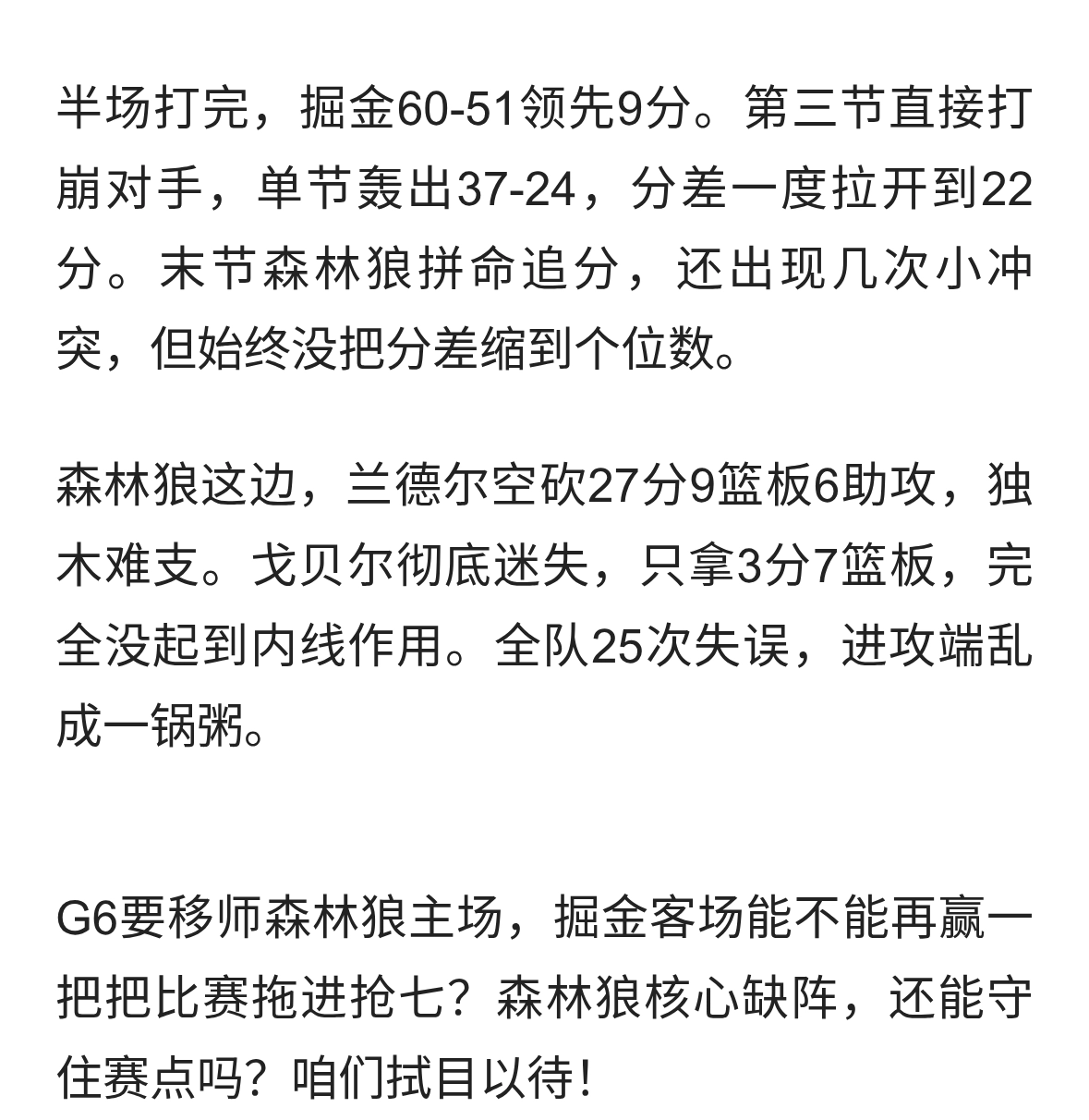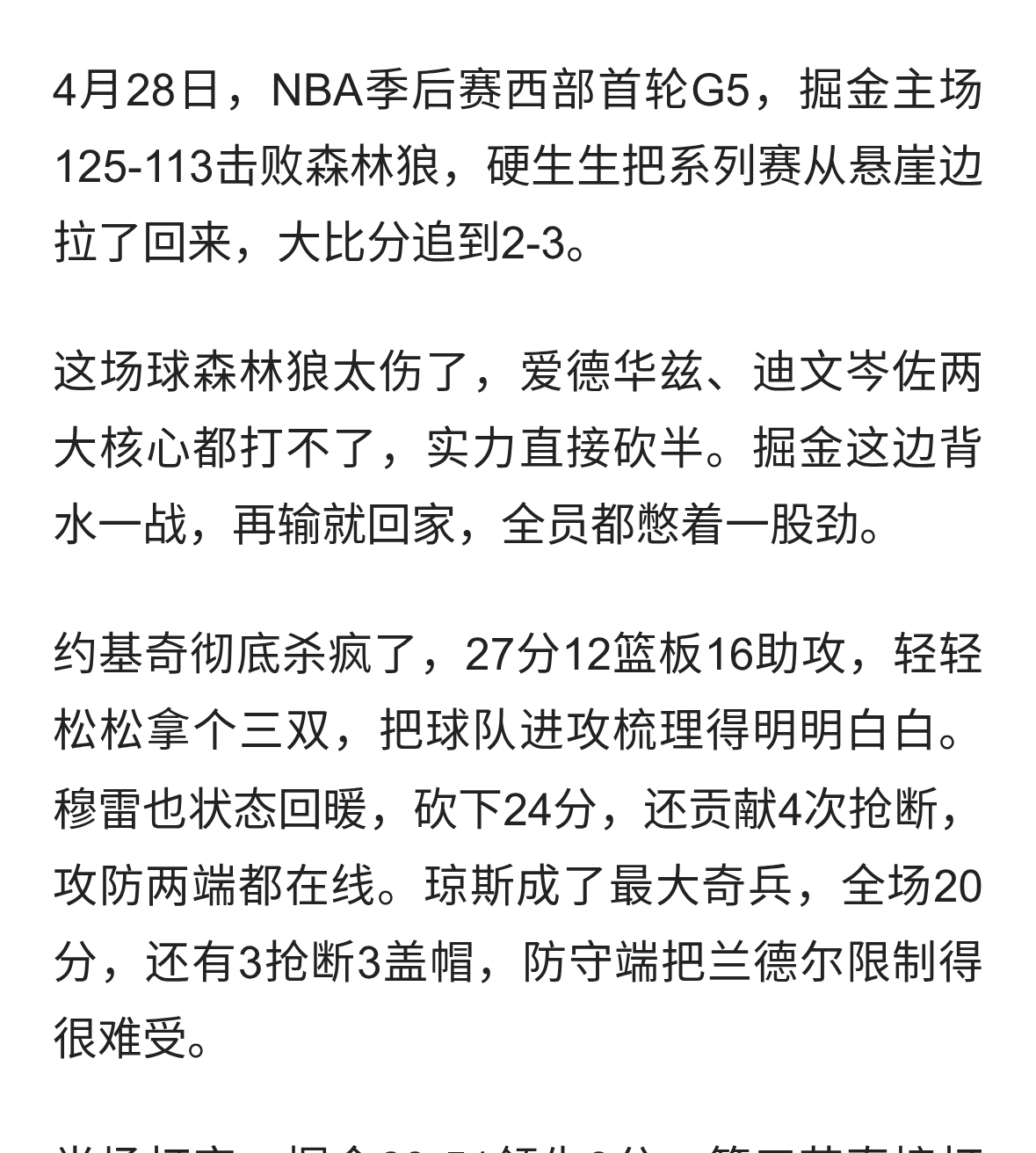 掘金G5险胜森林狼!赢是赢了,但这态度真能翻盘?说掘金这场赢球了,可我看得一