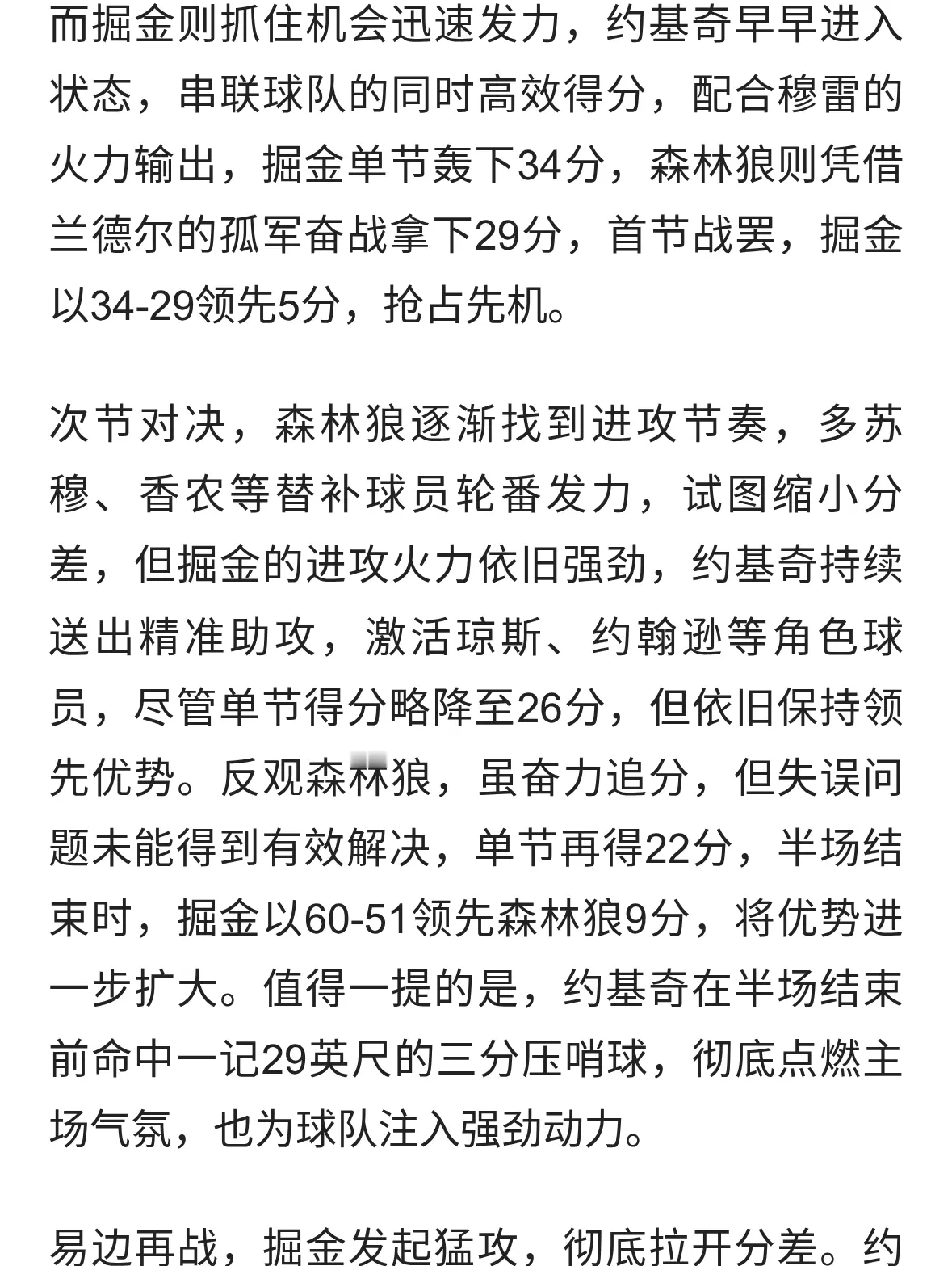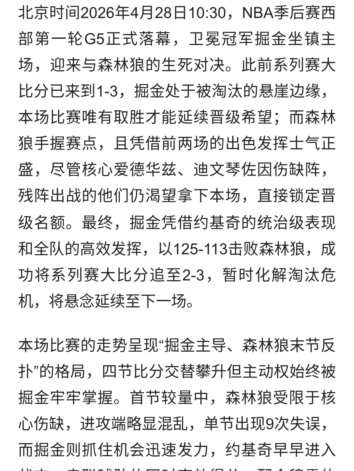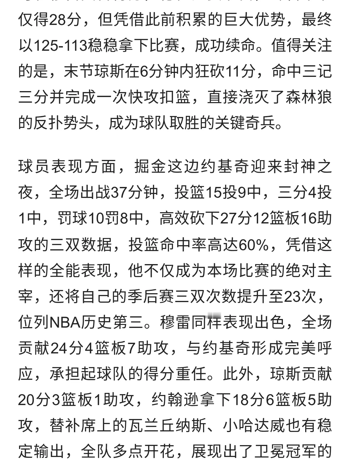 绝境!掘金125-113力克森林狼,约基奇三双封神,系列赛追至2-3