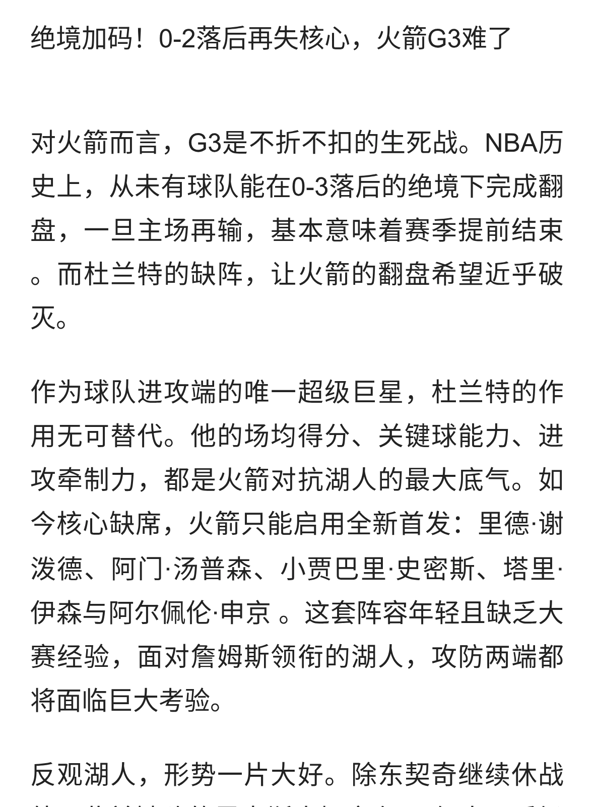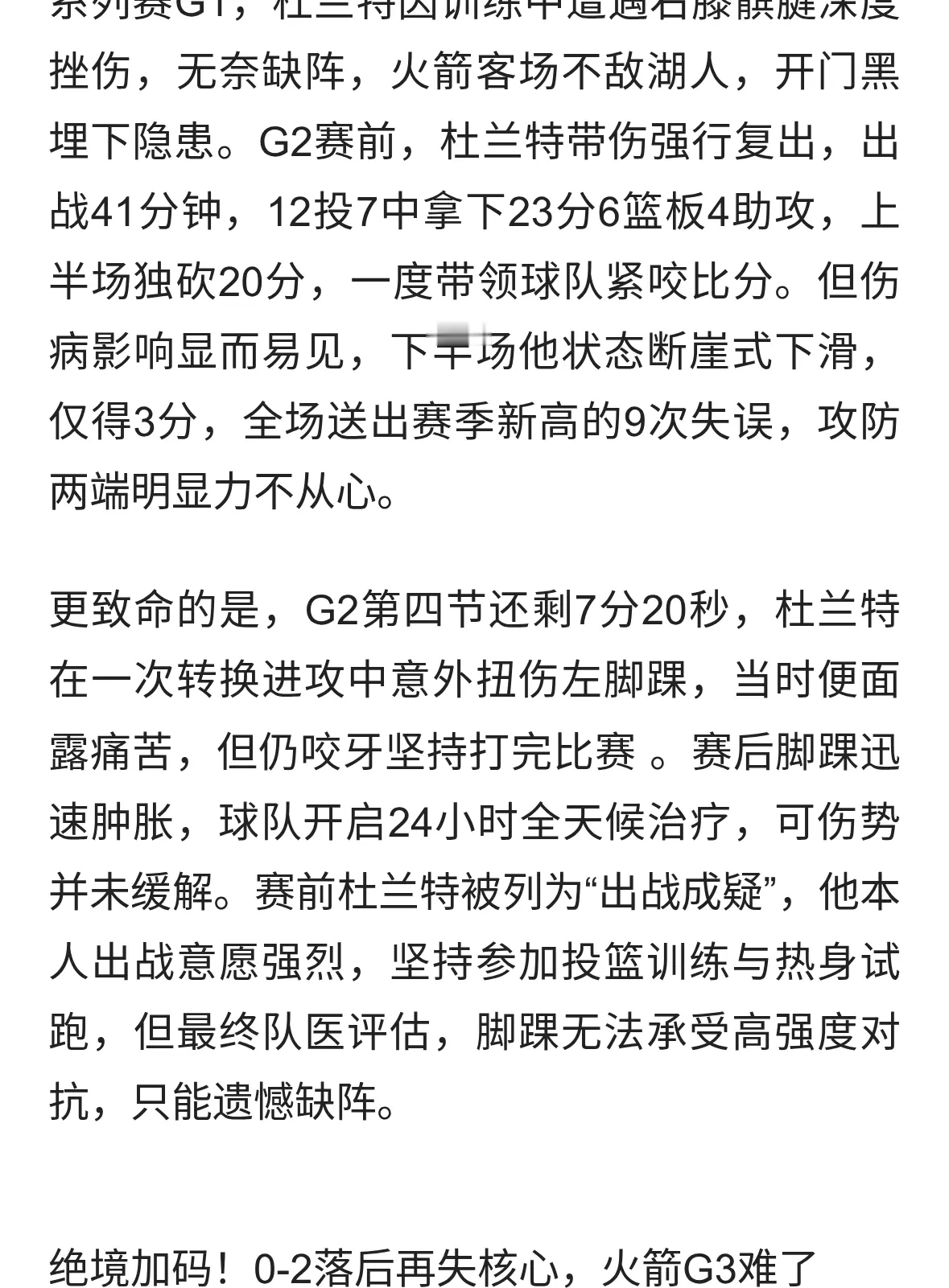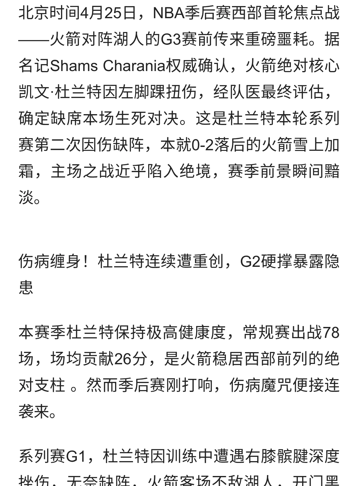 杜兰特左脚踝扭伤确认缺席火湖G3,火箭0-2落后再遭致命打击,