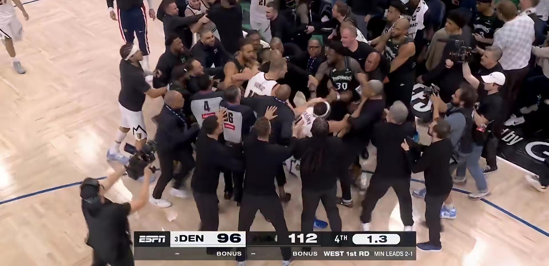 打起来了。森林狼3比1掘金,爱德华兹伤退,阿约多森姆MVPnba季后赛森林狼掘金