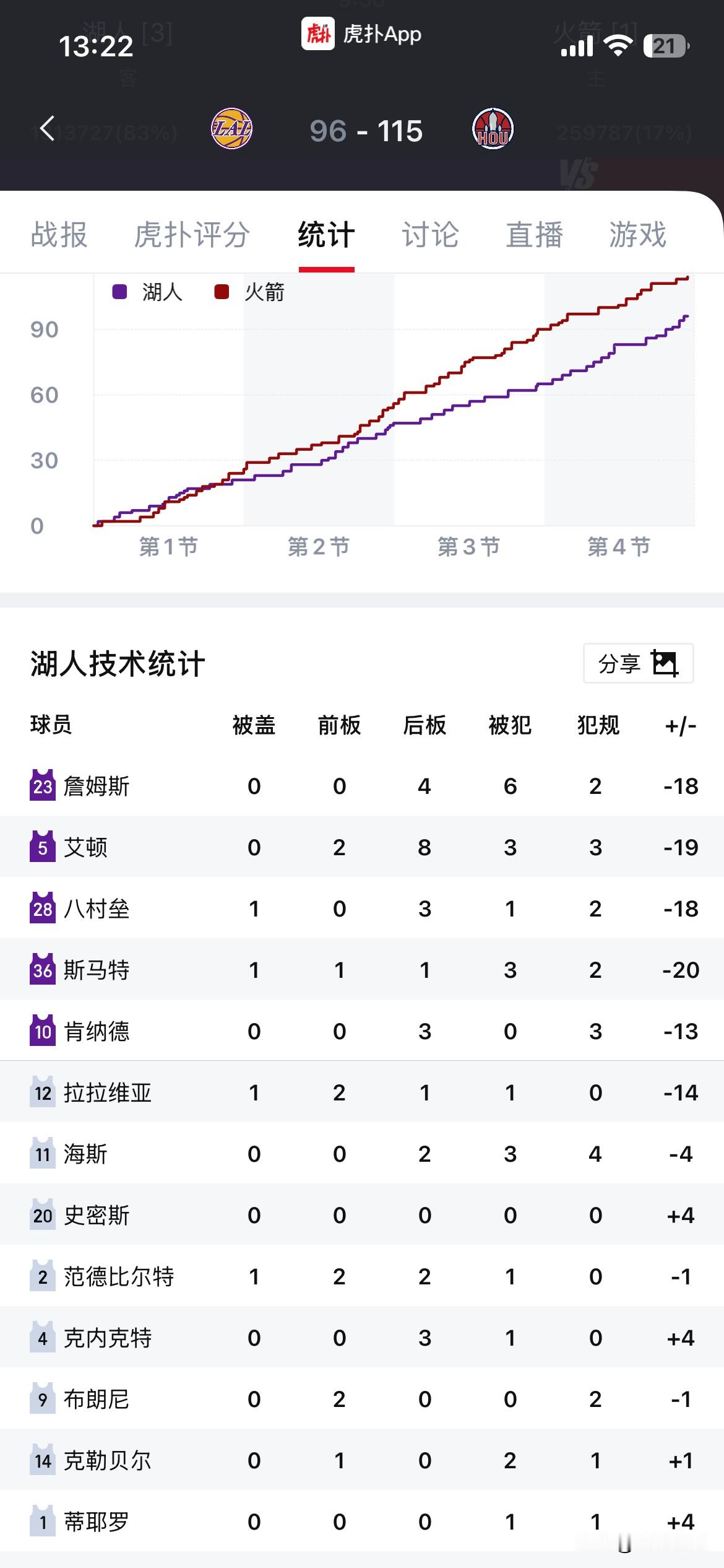 本场比赛湖人首发球员正负值全部为负数,没有人能够提供火力支持。唯一一个表现还算正常的艾顿还被吹了一个二级恶意犯规,直接驱逐出场!就连赛后火箭教练乌度卡都没想到这个犯规会升级成二级恶意犯规!湖人今天真够冤的,连替补中锋海斯都领到了4次犯规➕1次技术犯规!直接影响后面湖人的篮板球保护,被火箭一波流拉开分差!从而输掉了本场比赛。