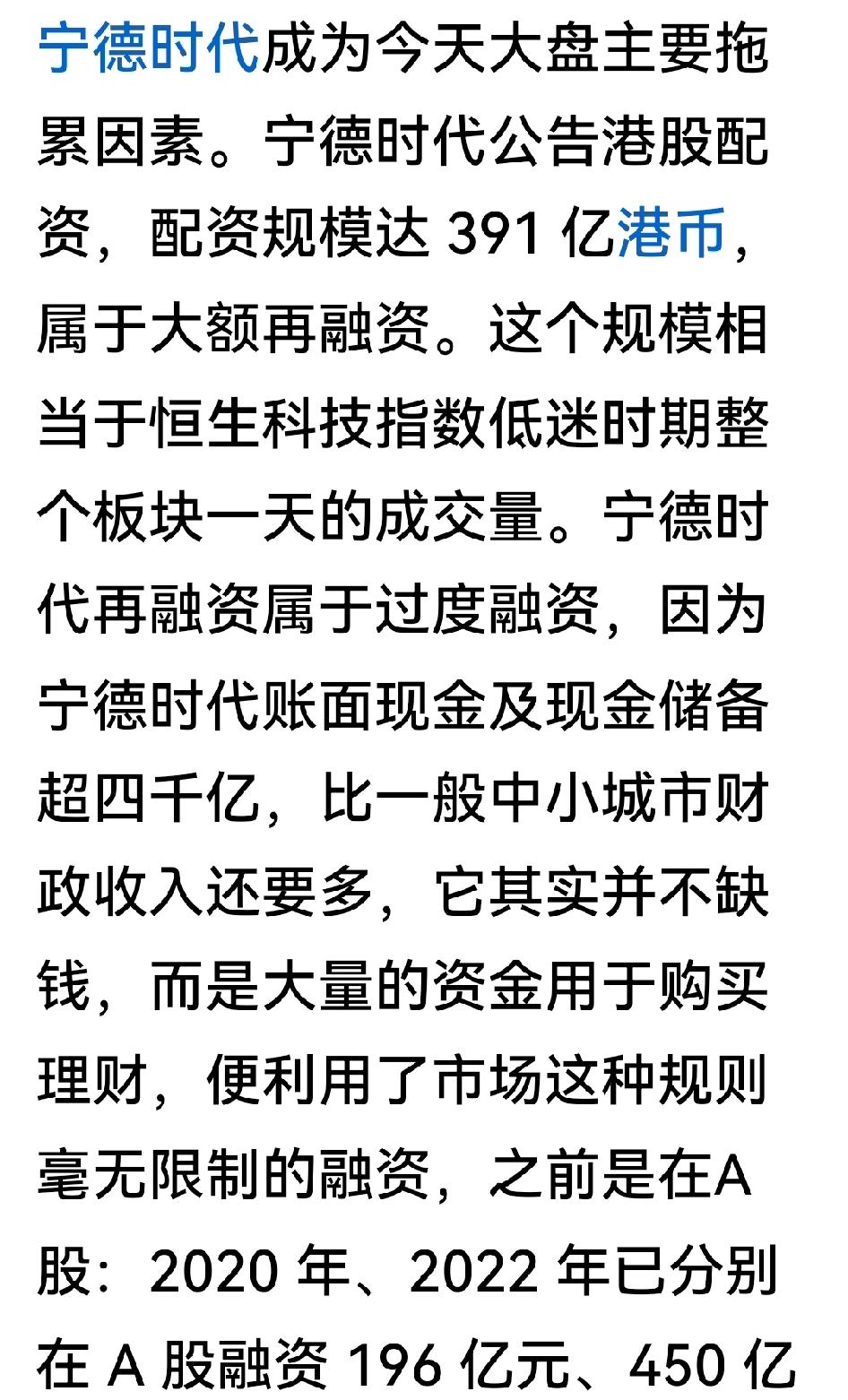李志林教授指出:宁德时代公告391亿港元的港股配资,是其2020年在A股融资196亿元、2022年在A股融资450亿元后的大额再融资,属于过度融资。这规模相当于低迷时恒生科技指数全天的成交金额,是今天恒生科技指数大跌1.2%、拖累大A的主要因素。