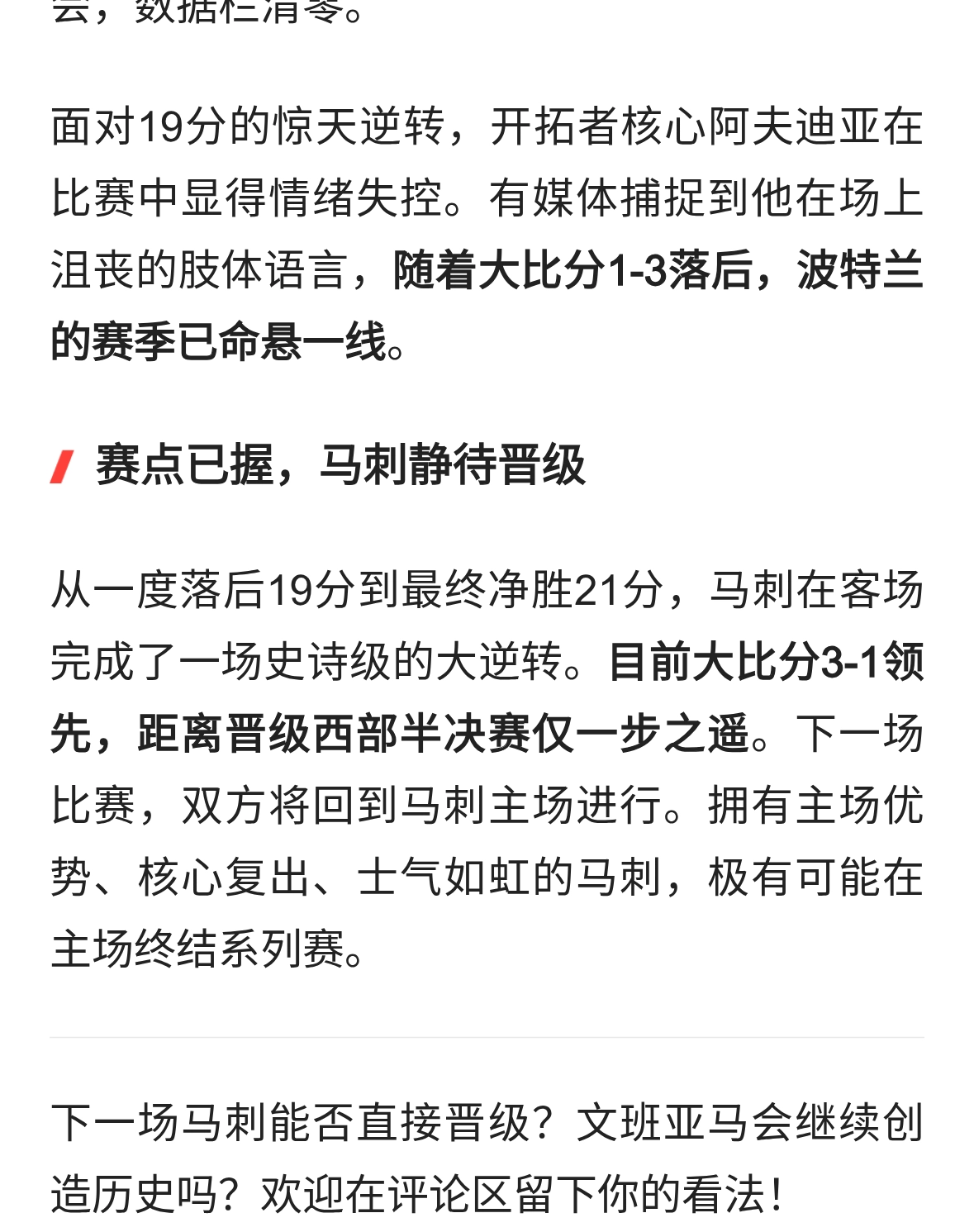文班亚马王者归来!马刺19分逆转开拓者夺赛点,3-1剑指半决赛