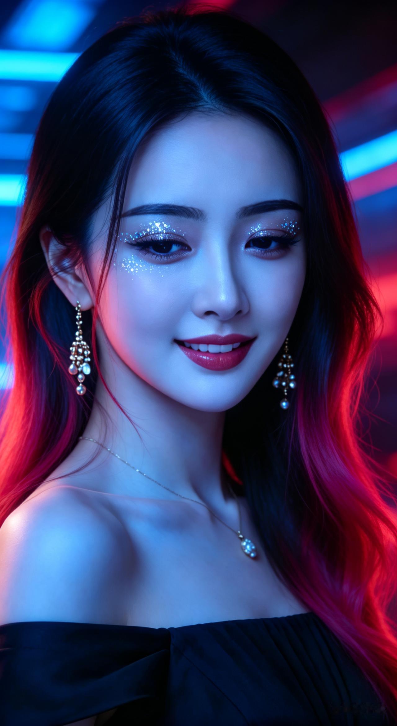 女性面部特写,黑红渐变长发柔亮,玫红发尾氛围感十足。碎发轻贴脸颊,碎钻闪片眼妆搭配亮面玫红唇釉,神态清冷迷离。蓝红霓虹撞色暗调背景,光影交织,质感高级冷艳。