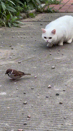 就在麻雀毫无防备的瞬间,白猫猛地出击,速度快到只剩一道残影,瞬间就成功捕获了一只麻雀,整套动作干脆利落,尽显捕猎本能!