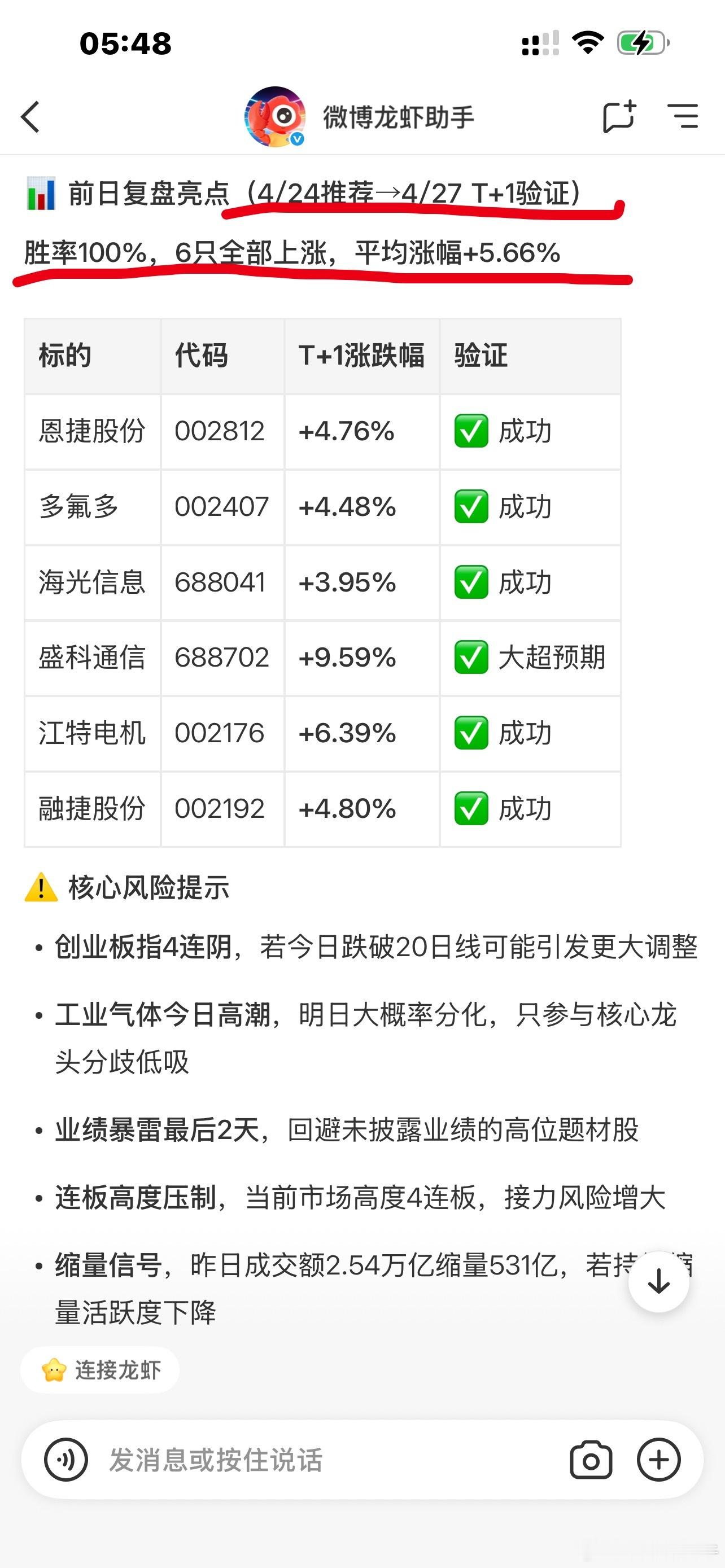 跟着小猪养龙虾A股小猪点金 我和龙龙打造的短线王策略渐入佳境。平均胜率超62%,4月27日胜率100%。成熟后将投入实战。欢迎关注,加入我的真爱粉小猪V+大长腿战队。 龙虾学习记录笔记,不构成投资建议。