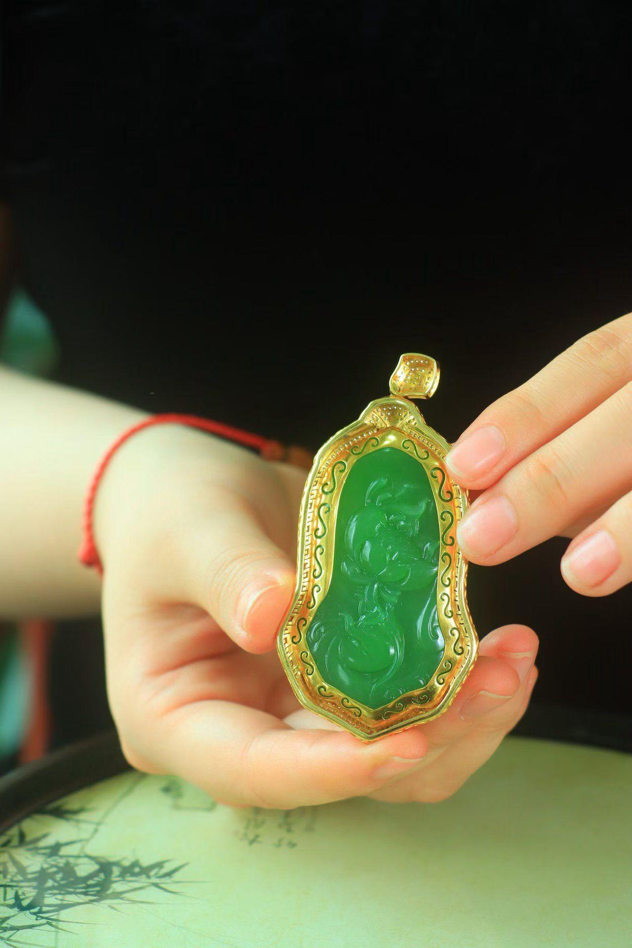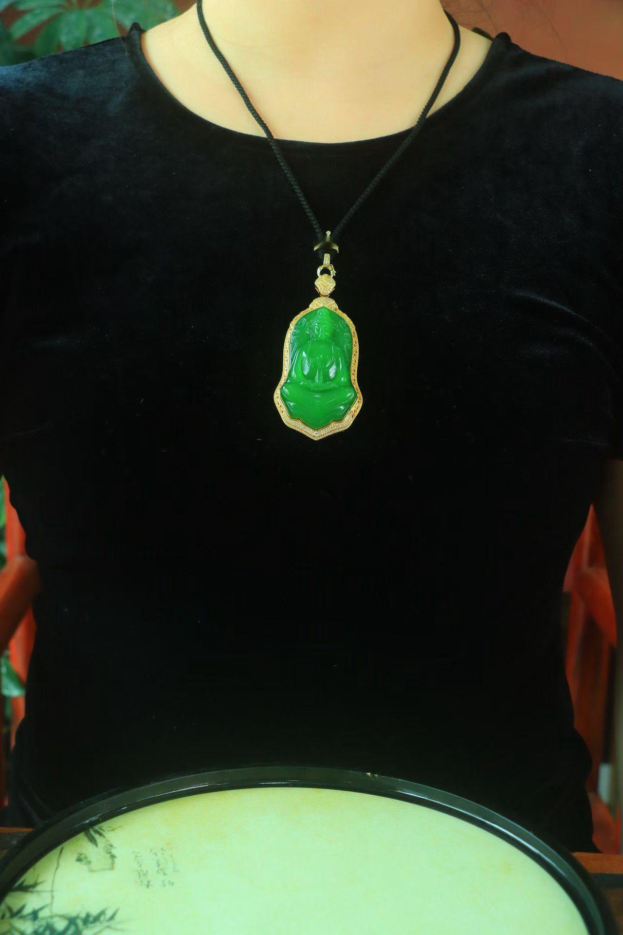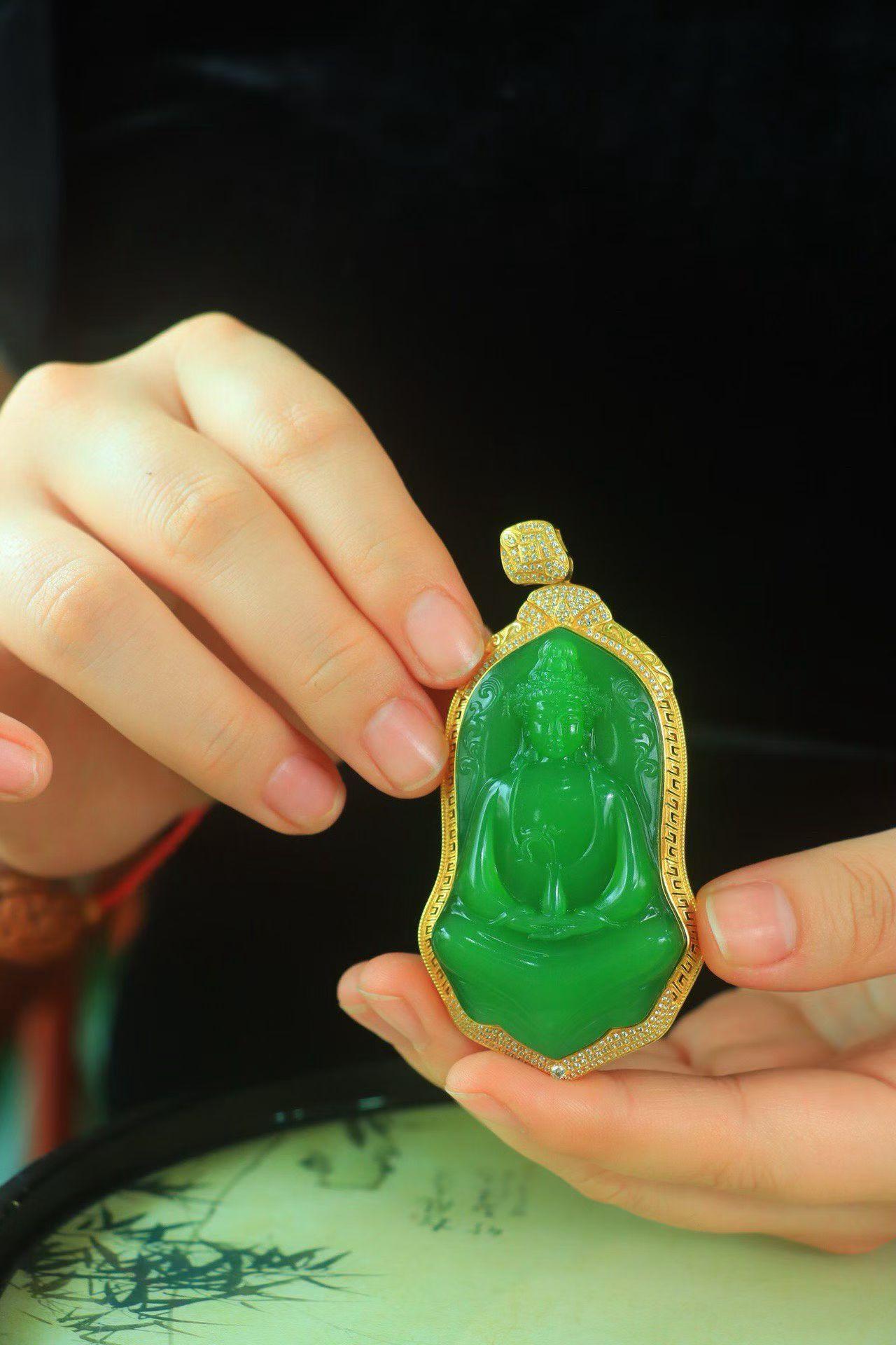 和田玉老坑粉青碧玉观音,18k金手工镶嵌,色泽浓郁,玉质莹润细腻,精琢观音双目低垂,神态静谧安详,衣带飘逸柔美,身前净瓶摆放一旁,无限慈爱地望向世间