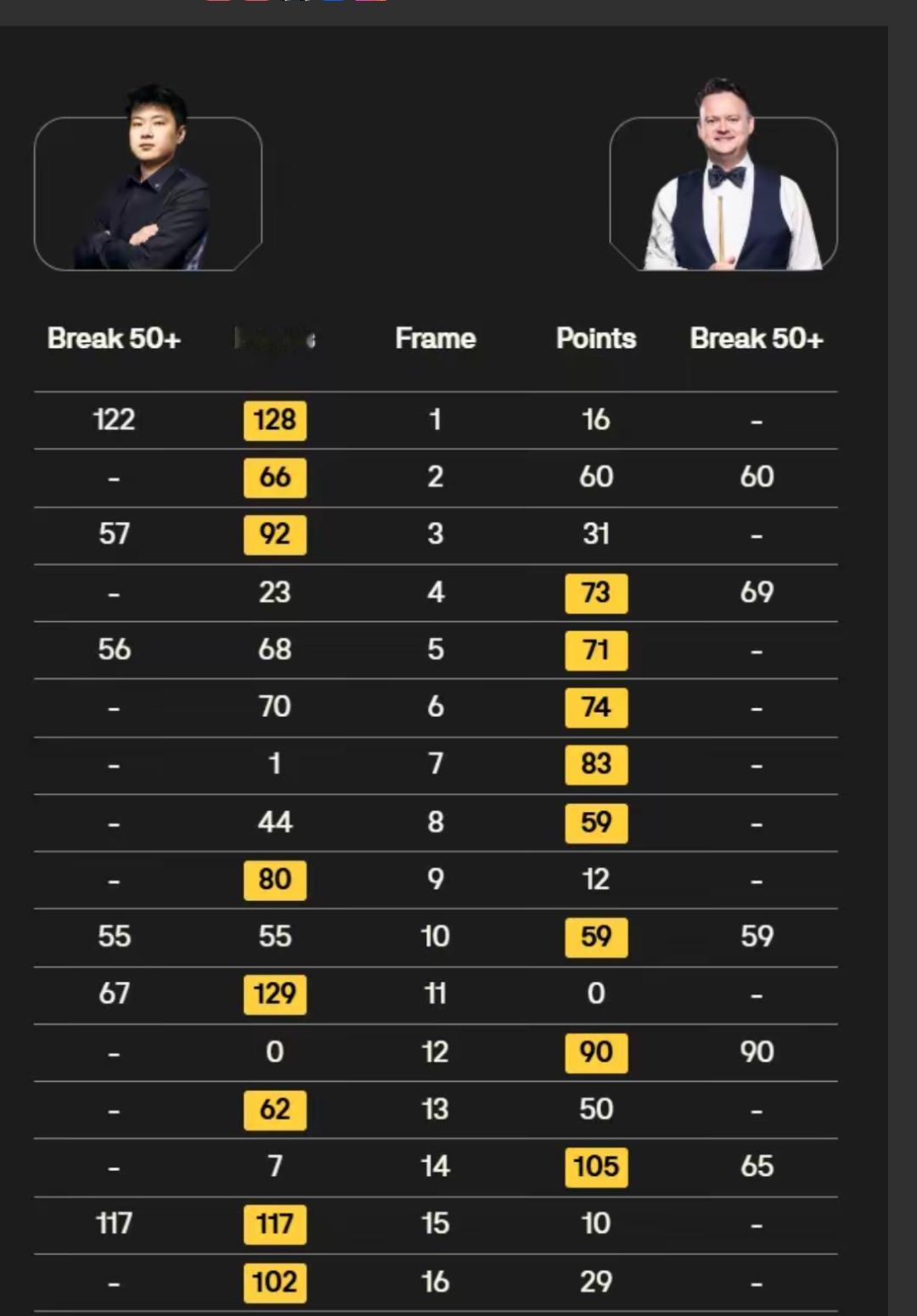 第十四局,墨菲打出单杆65分,105:7拿下,墨菲局分8-6领先。