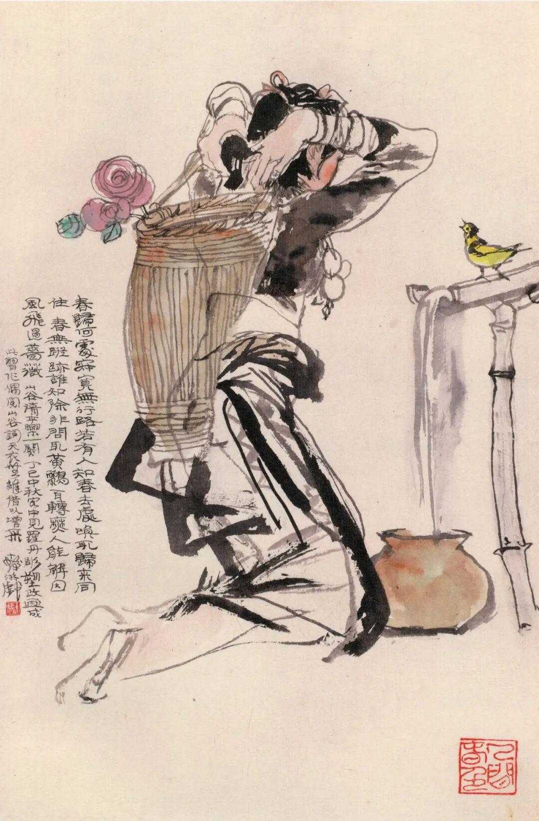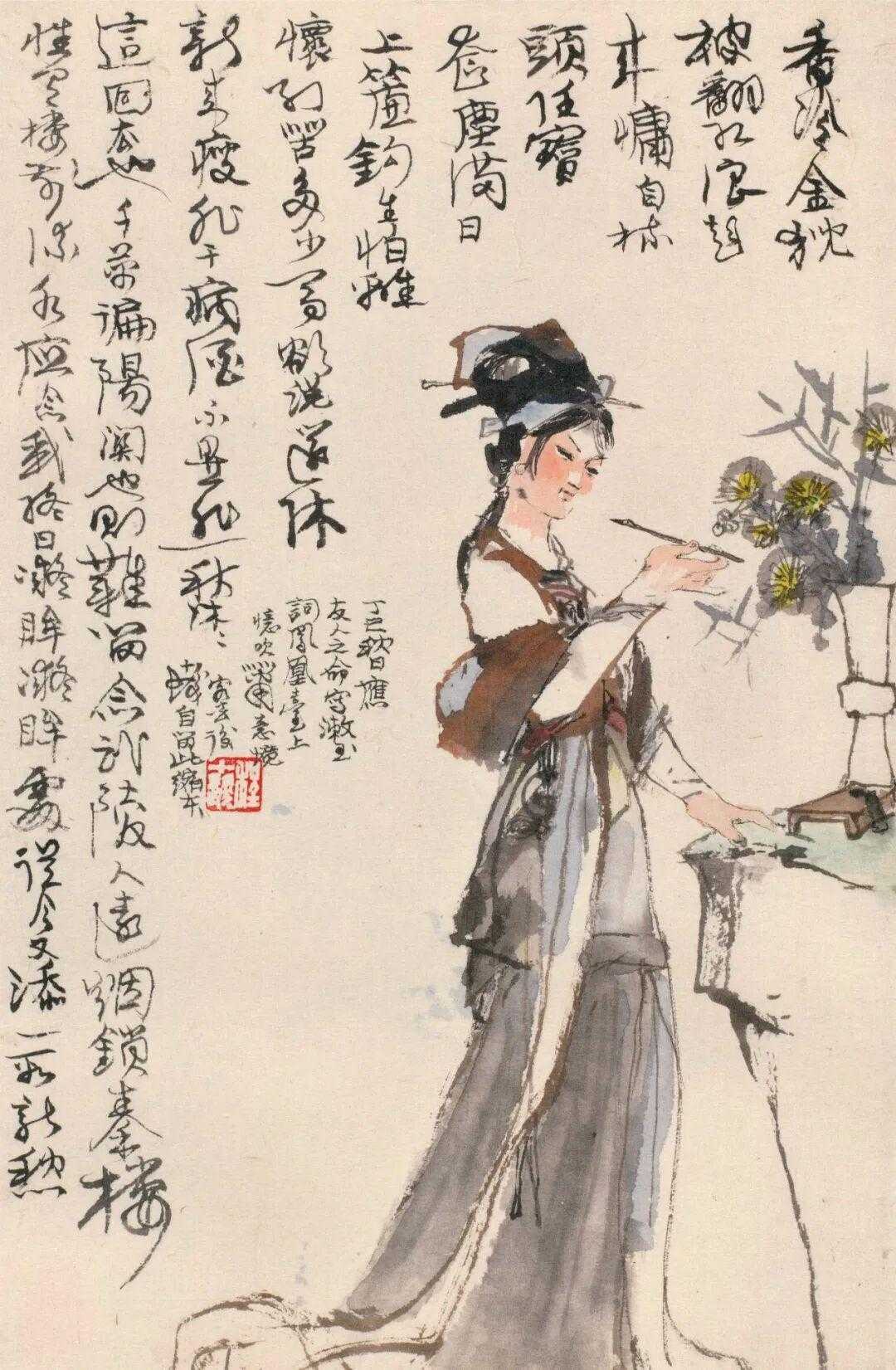 程十发 丁巳写宋人词意册。程十发,中国海派书画巨匠。他最早主攻山水,此后相继以人