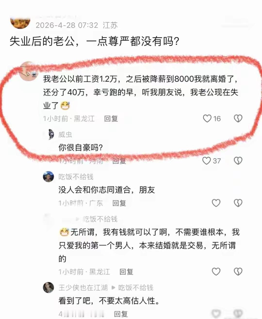 她离婚不是因为家暴、出轨,只是因为丈夫的收入,从1.2万降到了8000。当得知前夫失业,她不仅没有半分愧疚,反而庆幸自己“跑得快”,仿佛甩掉了一个烫手的累赘。