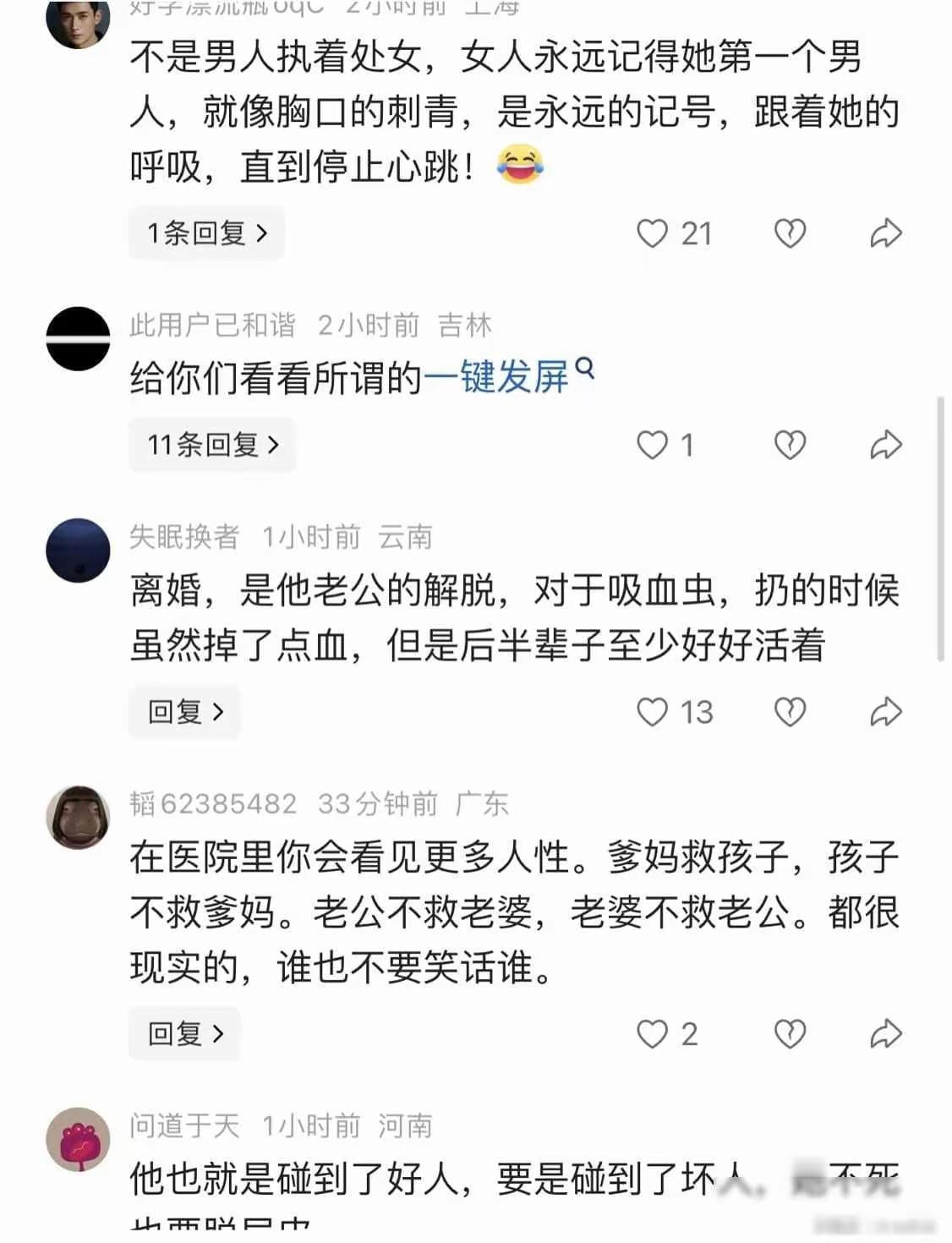评论区有人愤怒质问:“你很自豪吗?”也有人冷冷接话:“离婚,是他老公的解脱,对于吸血鬼,扔的时候虽然掉了点血,但是后半辈子至少好好活着。”