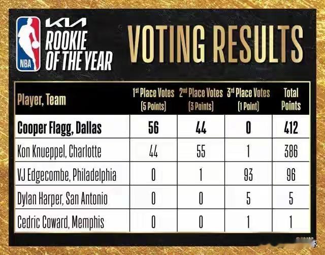 NBA2026最佳新秀实至名归还是库珀·弗拉格,以412票领先第二名克...
