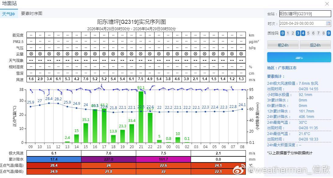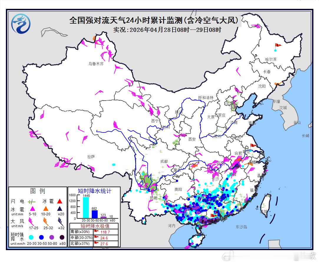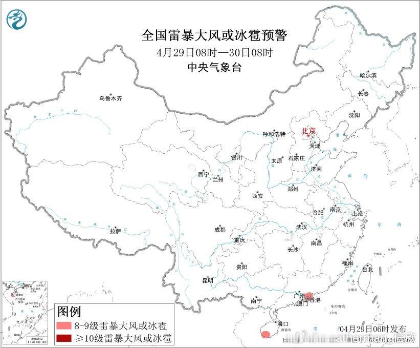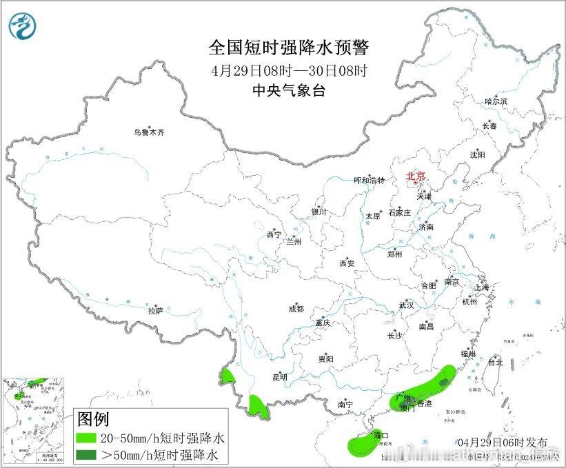 中央气象台今晨继续发布强对流天气蓝色预警:预计4月29日08时至30日08时,广东中南部、海南岛西南部等地的局地将有8级以上雷暴大风或冰雹天气;华南东南部、西南地区西南部等地的部分地区将有小时雨量大于20毫米的短时强降水天气,其中,广东中南部和西南部沿海等地的局地小时雨量大于50毫米,最大可达60毫米以上。
