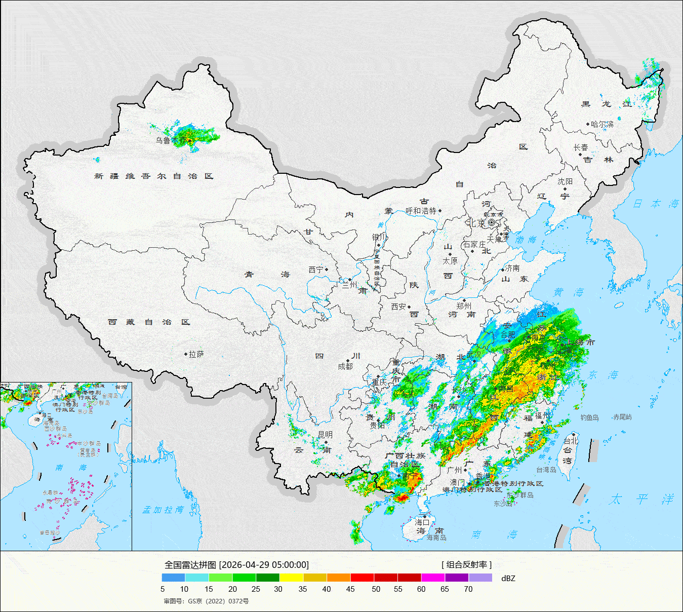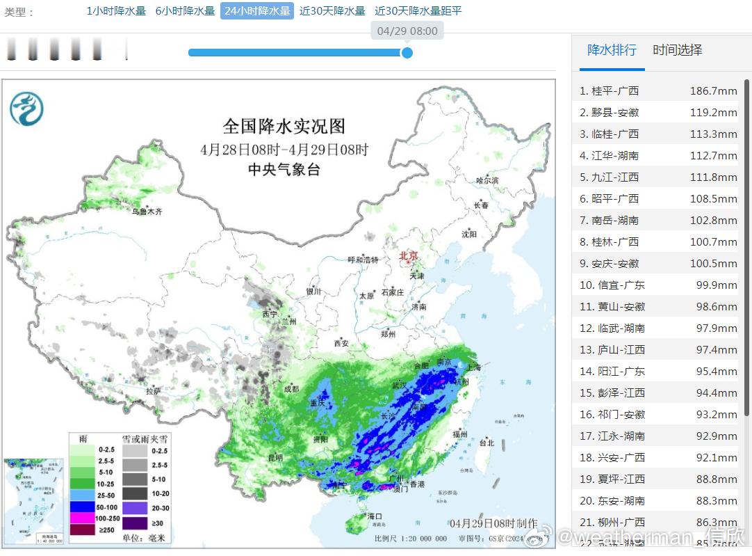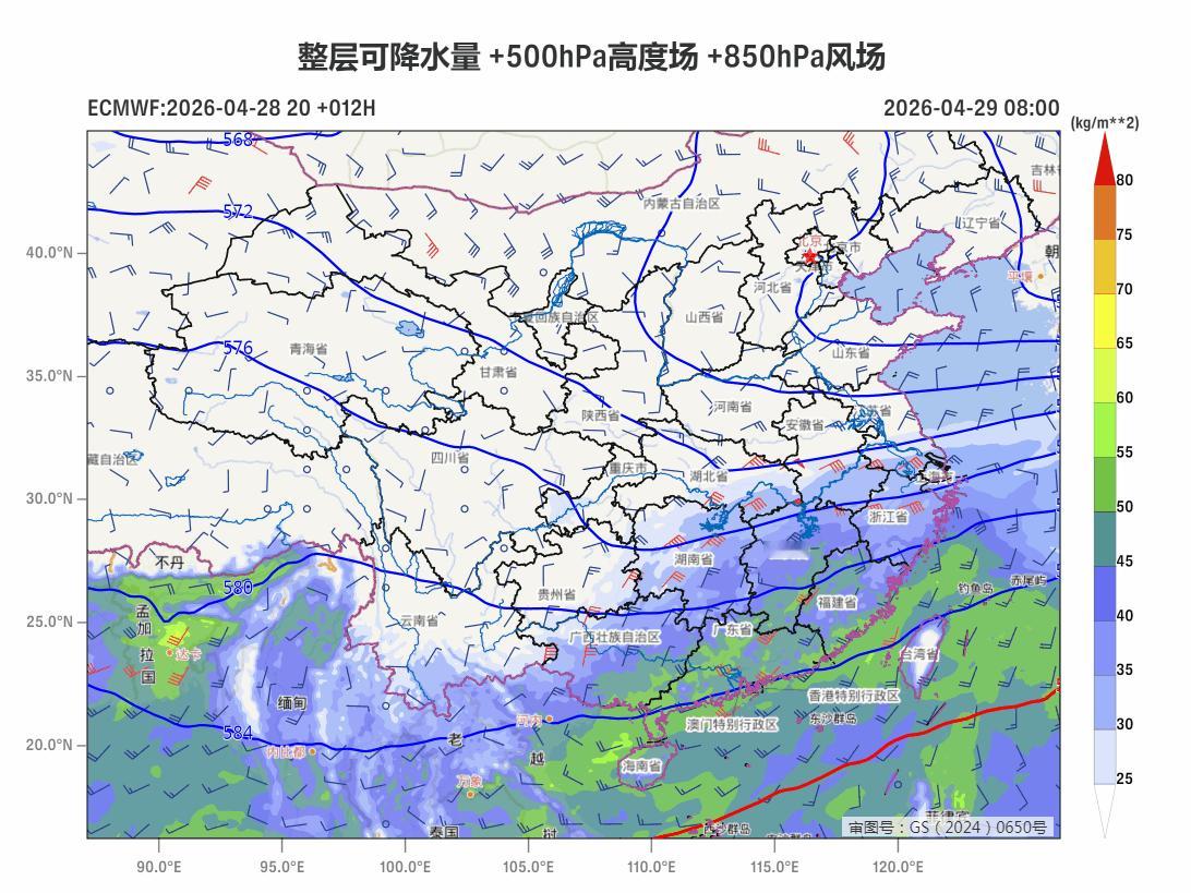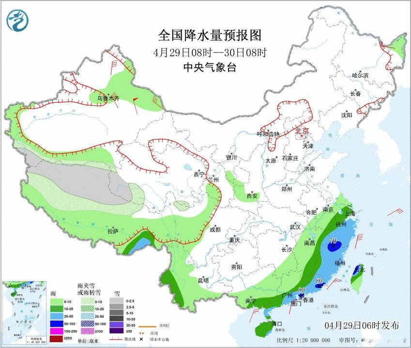 4月29日08时至30日08时,西藏东南部、江南东部、云南西南部、华南东部和南部等地部分地区有中到大雨,其中,浙江南部、福建北部、广东东南部、台湾岛北部等地部分地区有暴雨(50~80毫米)。4月30日-5月1日江南华南大部降水处于间歇期。5月2日-3日,南方还有强降雨。