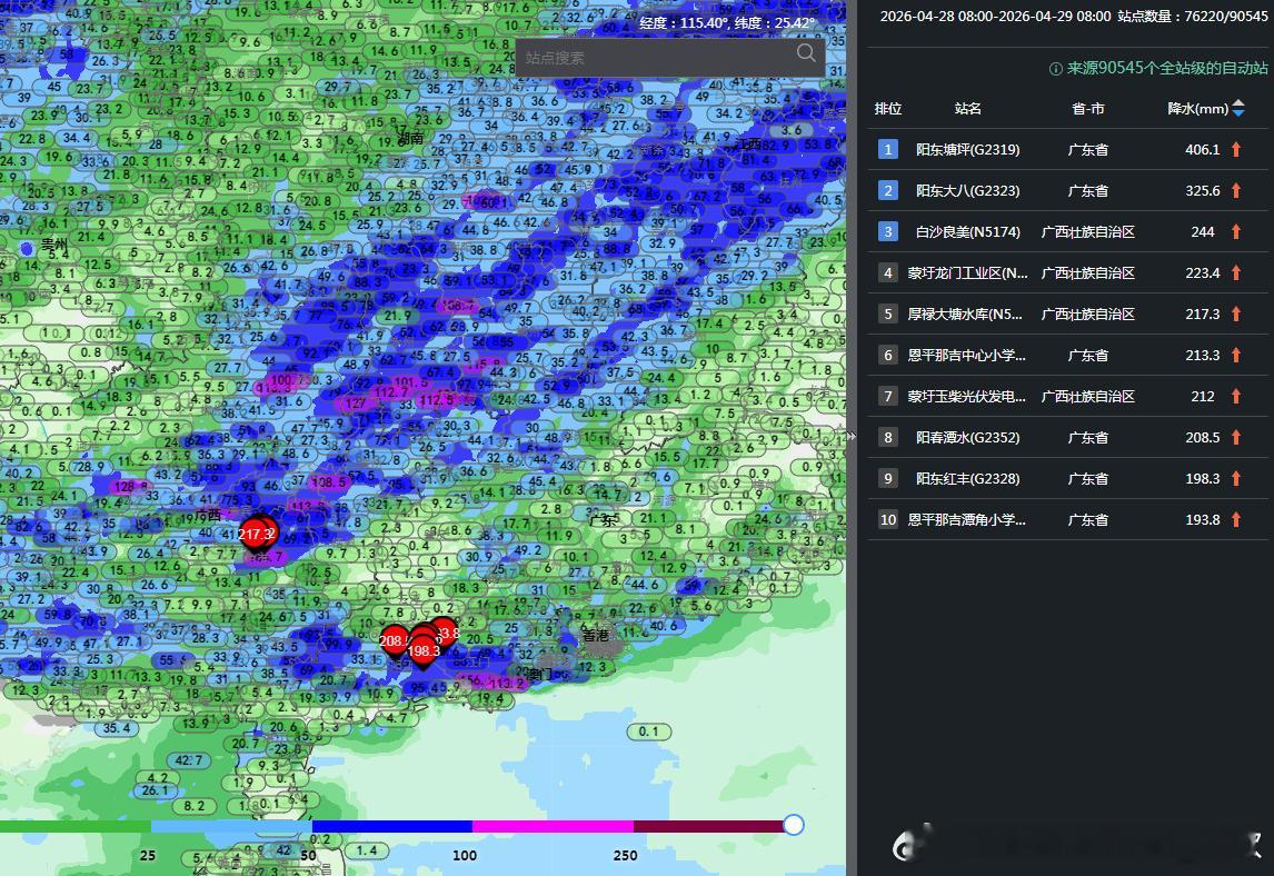 从区域自动站看,广东阳东塘坪406.1毫米、阳东大八325.6毫米,出现特大暴雨。从今晨的雷达动画看,南方依然可见系统性较大范围的低涡切变线降水,以及华南的暖区对流降水。未来低涡切变线继续东移,今夜低涡入海,因此今晚到明天南方降雨会自西向东减弱。而在雨带南侧尾端,依然要警惕强对流。