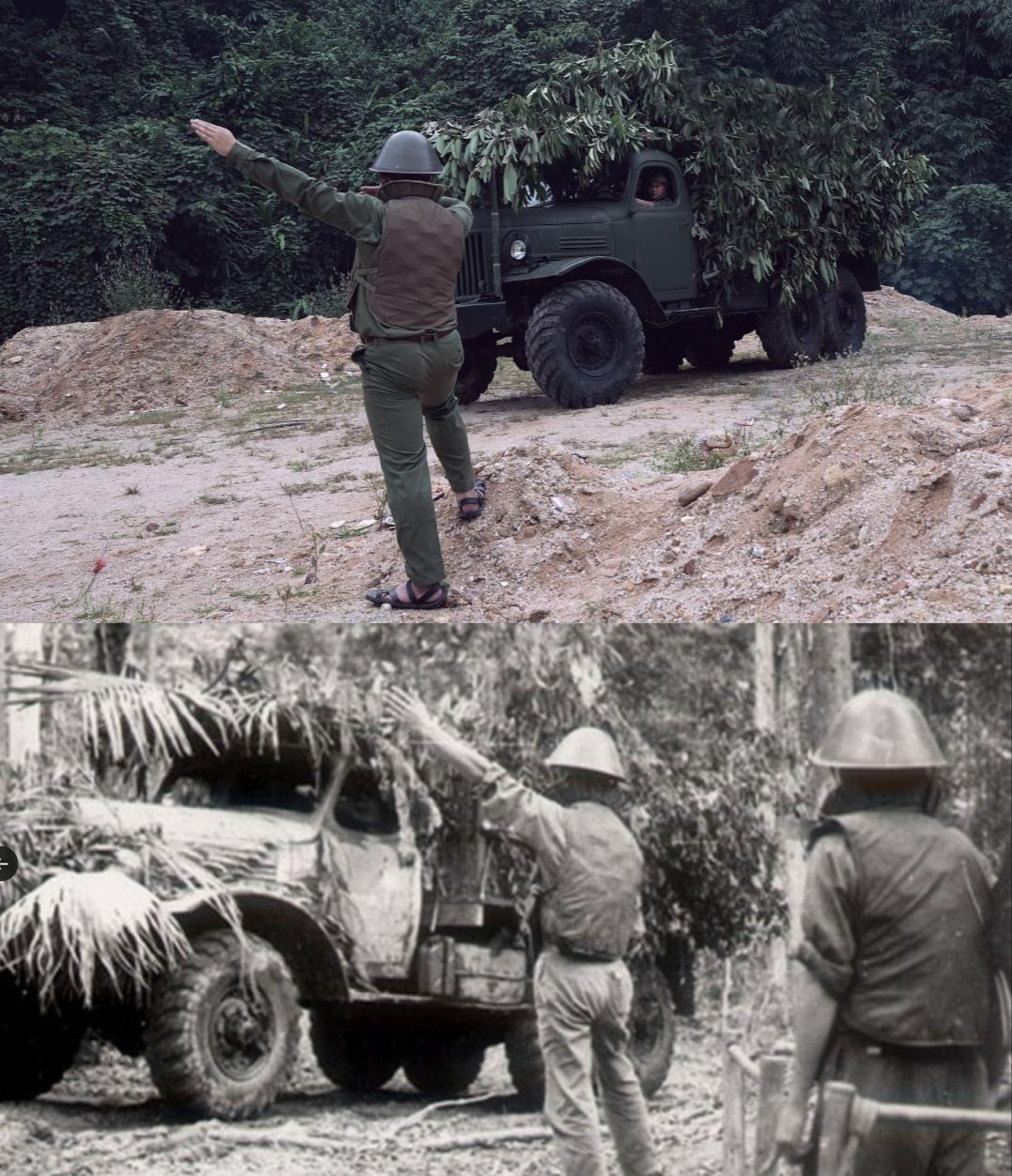 越南军迷头戴东德M56“蘑菇头”钢盔,穿凉鞋重演当年越南战争时期的历史照片(图1,图2)