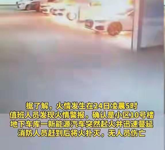 等大家穿好衣服跑到车库的时候,火已经烧得挺大了,最先起火的是一辆新能源汽车,整个车头都被火焰裹住,旁边停着的几辆燃油车也被波及,车身烤得变了形,车库里的消防管道、墙面照明设备也被烧得七零八落,浓烟滚滚的。