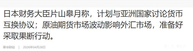 4月28日,日本财务大臣片山皋月表示:日本已经正式准备好,要和亚洲国家讨论签署新的货币互换协议。她还特意补了一句,“原油期货市场的剧烈波动正在冲击全球外汇市场,日本随时会采取果断行动。”