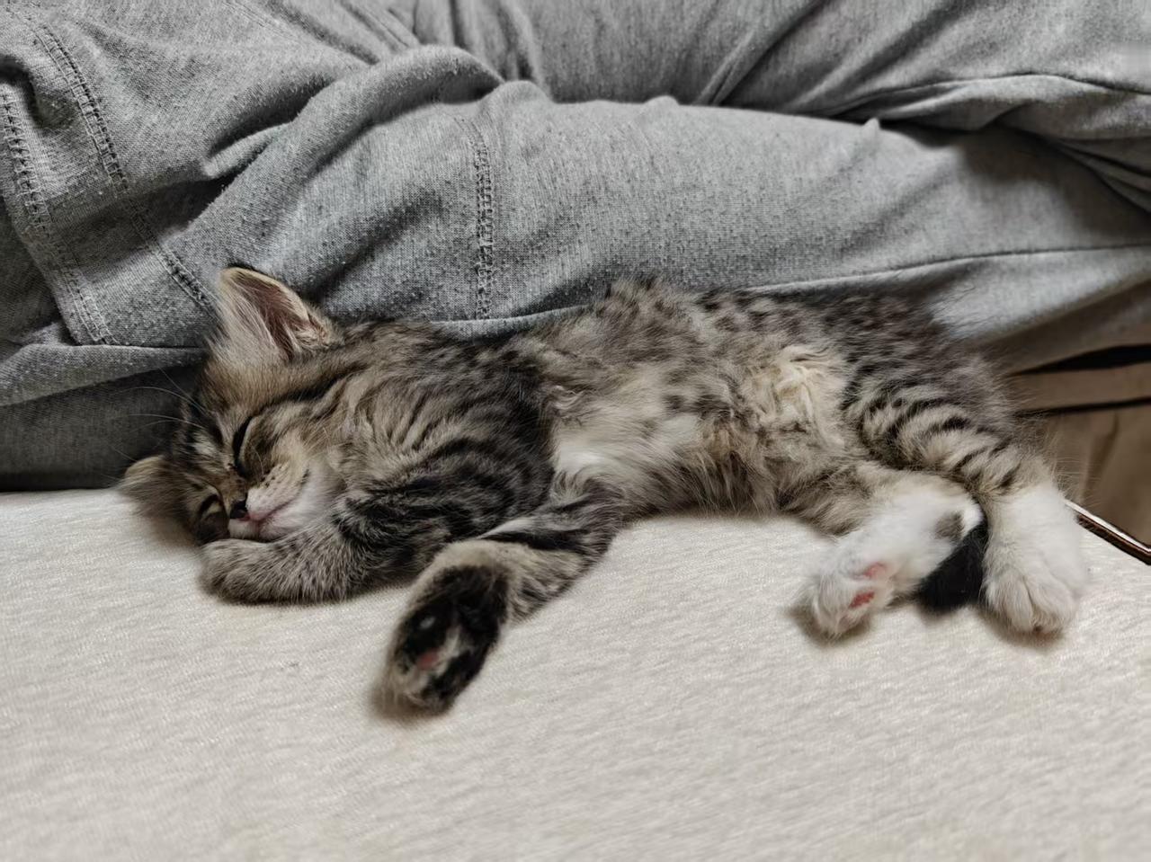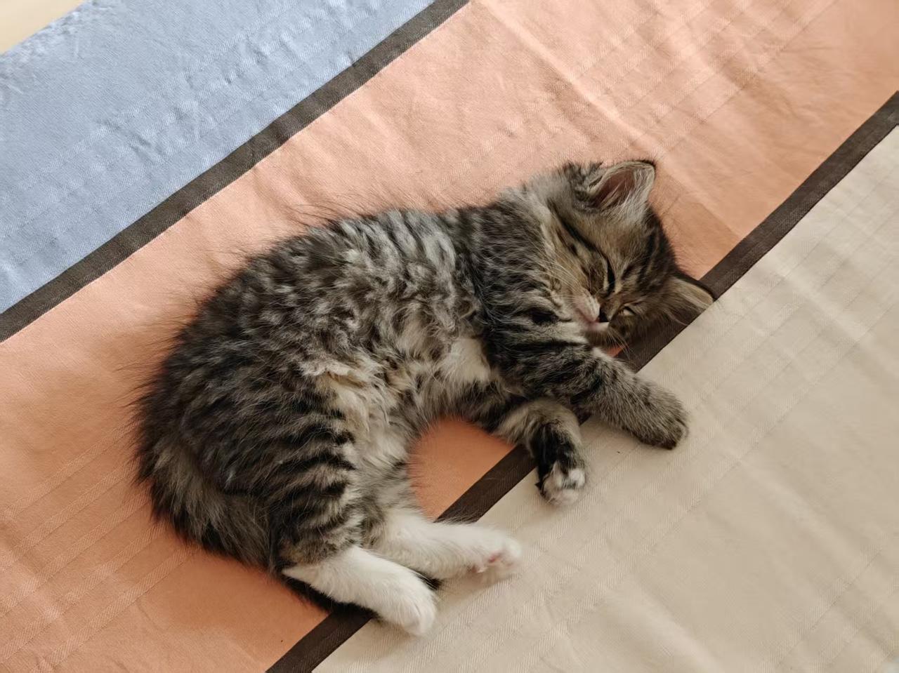 所以现在我们有了一只可爱的小猫,刚拿回来的时候才满月,有时候藏在猫窝里不出来,有时睡在沙发的一角,不喝羊奶,奶凶奶凶的,对着镜子和自己打架,在沙发靠背后面的间隙不出来,再或者跑到床头后面滚一身土跑出来。有时候睡在茶几的烟灰缸里,我们有时候洗澡上厕所一出来,发现她在外面可怜巴巴的蹲着抬头看你,瞬间都要把你的心萌化了。和我们熟了之后开始在家里跑酷,晚上我们睡觉她偷偷的溜进来爬到床上,在我们身边睡觉,刚开始呼噜呼噜的响着,再一会儿就睡着了,也不打呼噜了,早上我们起来,用手轻轻拢抱着她,她也不抓你,还在四仰八叉的睡着,有时候还要抱住你的手臂睡。她妈妈教的很好,会上厕所,就是有时候带出猫砂,我们都经常收拾,每天铲屎、换水换粮,乐此不疲。有时候她也会发神经轻轻咬你,还是那种抱着咬你,我们就假装哭,然后她就跑开了。打完两针的小猫已经成了我们的好朋友。每天下班回家一开门叫几声元宝,她就会屁颠屁颠的一路小跑过来,蹭蹭你的裤脚。这一刻一天的疲惫已经消了大半!