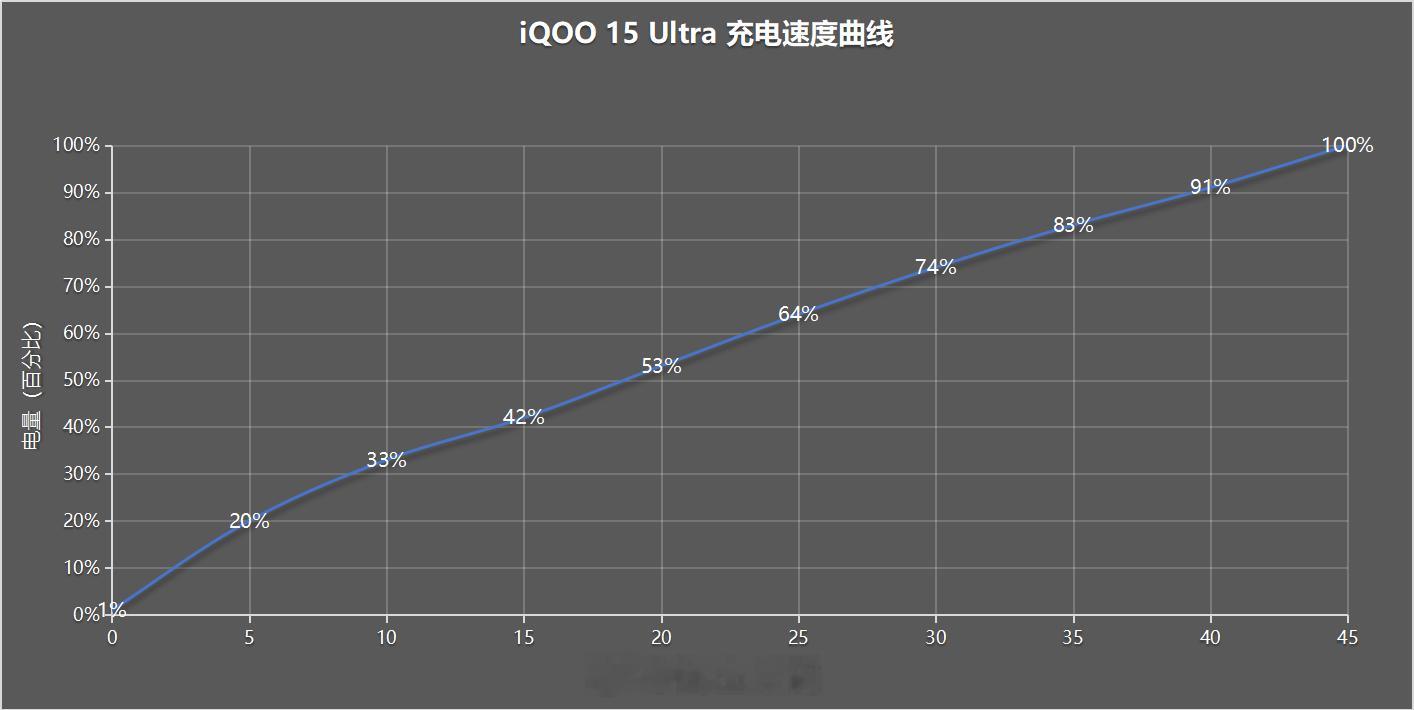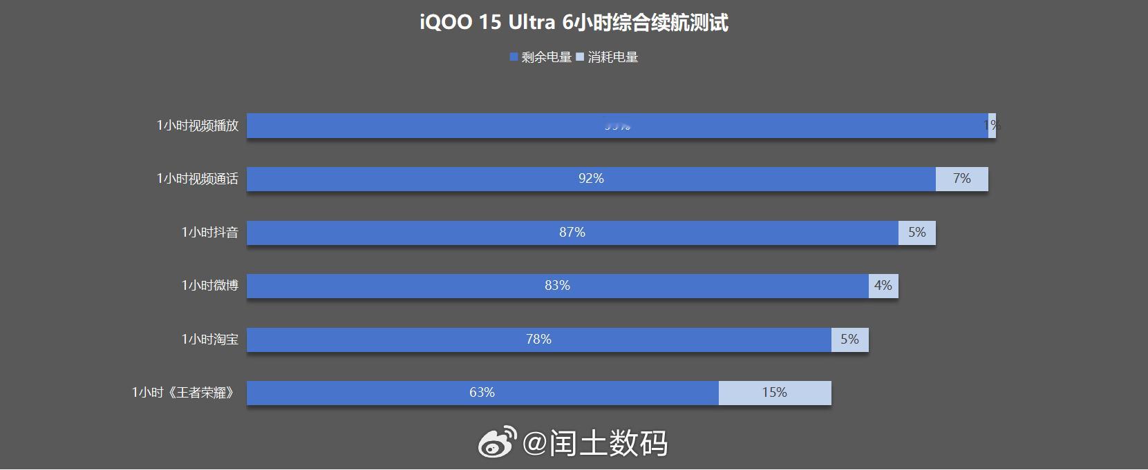 iQOO15 Ultra iQOO 15 Ultra搭载7400mAh硅碳负极电池,支持100W有线快充与40W无线快充。在25℃室温的安兔兔测试中,6小时综合续航(含视频、社交、购物、游戏等场景)后剩余电量63%;3小时游戏续航分别测试《王者荣耀》《原神》《崩坏:星穹铁道》,各小时耗电分别为10%、13%、19%。iqoo好用数码好物种草计划iqoo