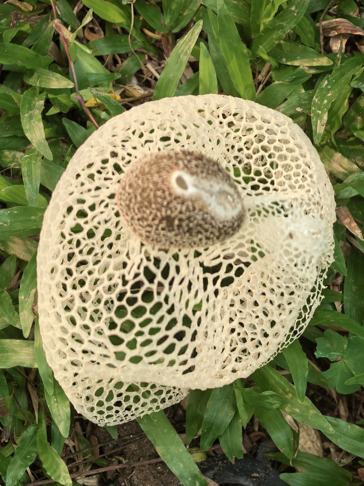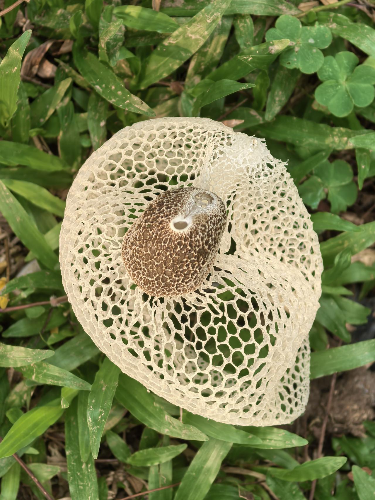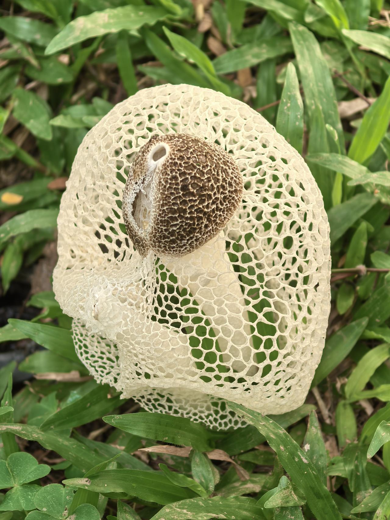 查询资料,这是长裙竹荪,一种外形极具辨识度的野生真菌,因其洁白如纱的网状菌裙,常被美称为“雪裙仙子”或“真菌皇后”。