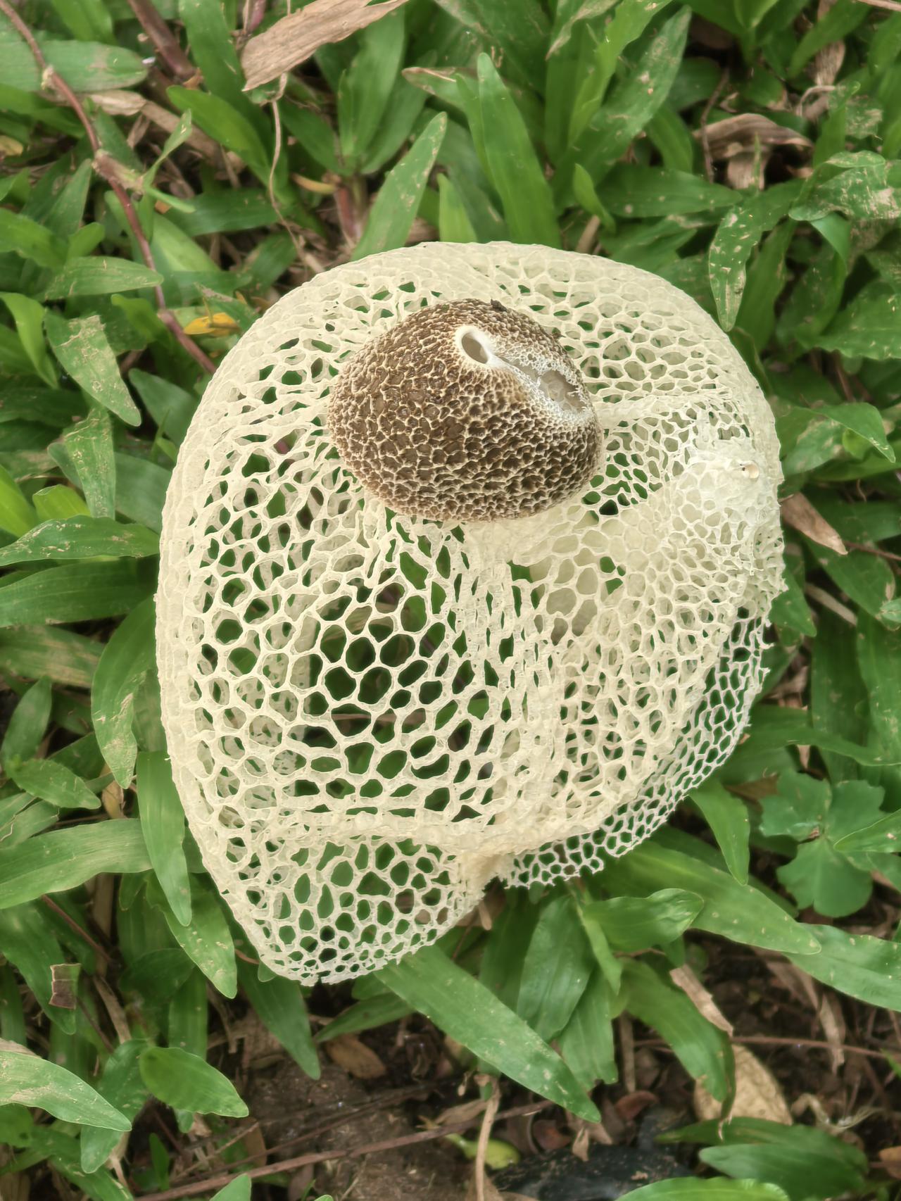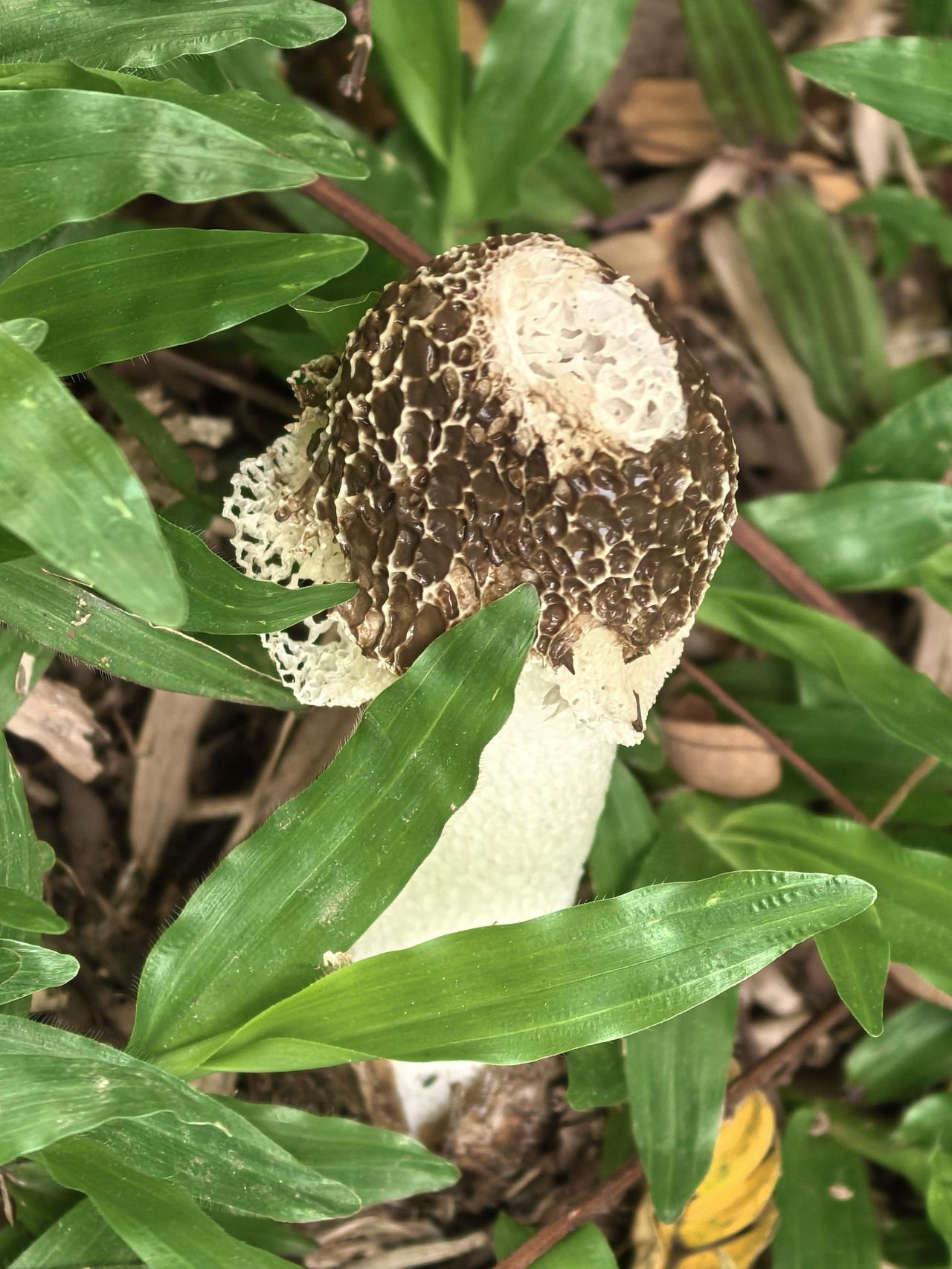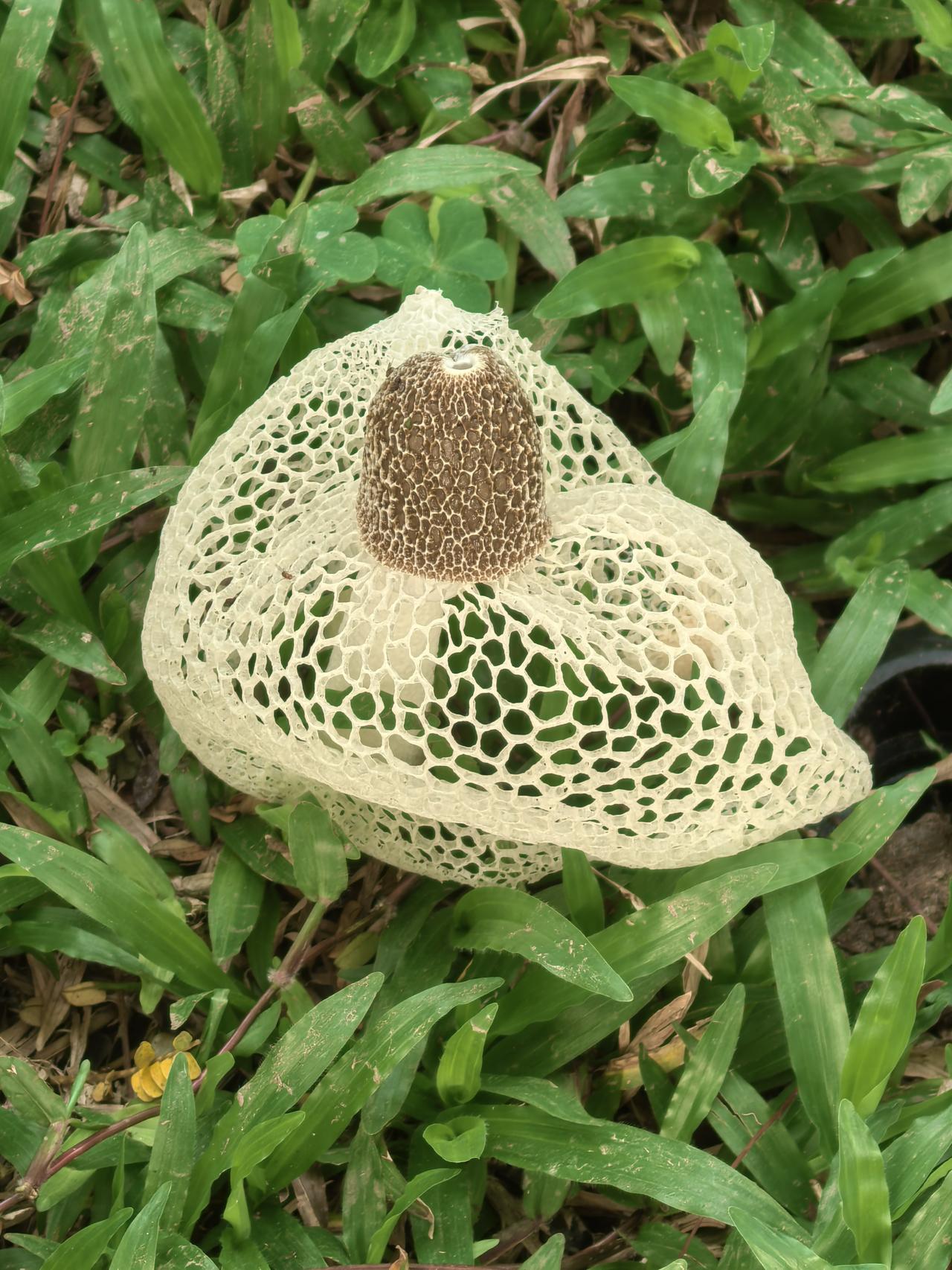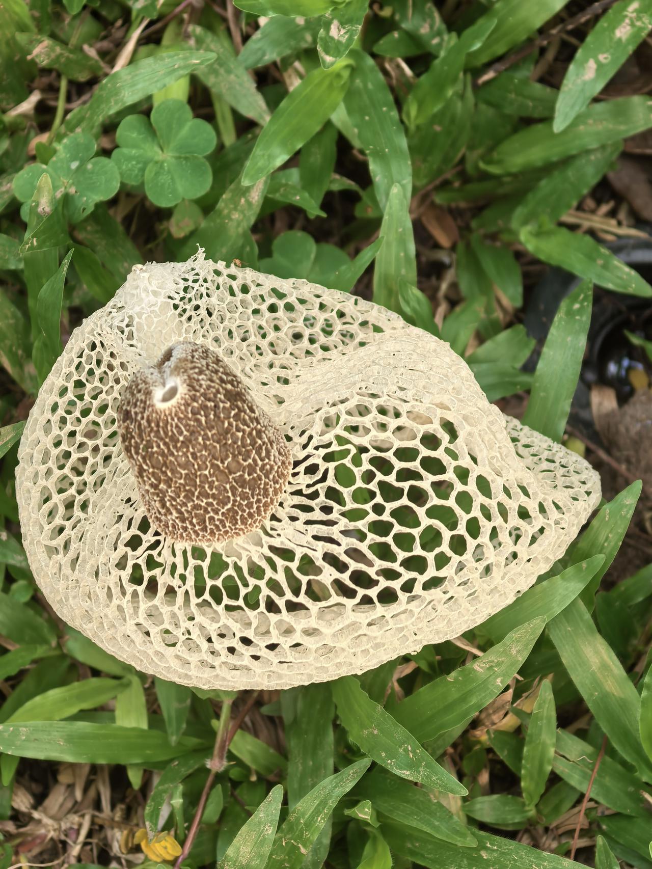 查询资料,这是长裙竹荪,一种外形极具辨识度的野生真菌,因其洁白如纱的网状菌裙,常被美称为“雪裙仙子”或“真菌皇后”。