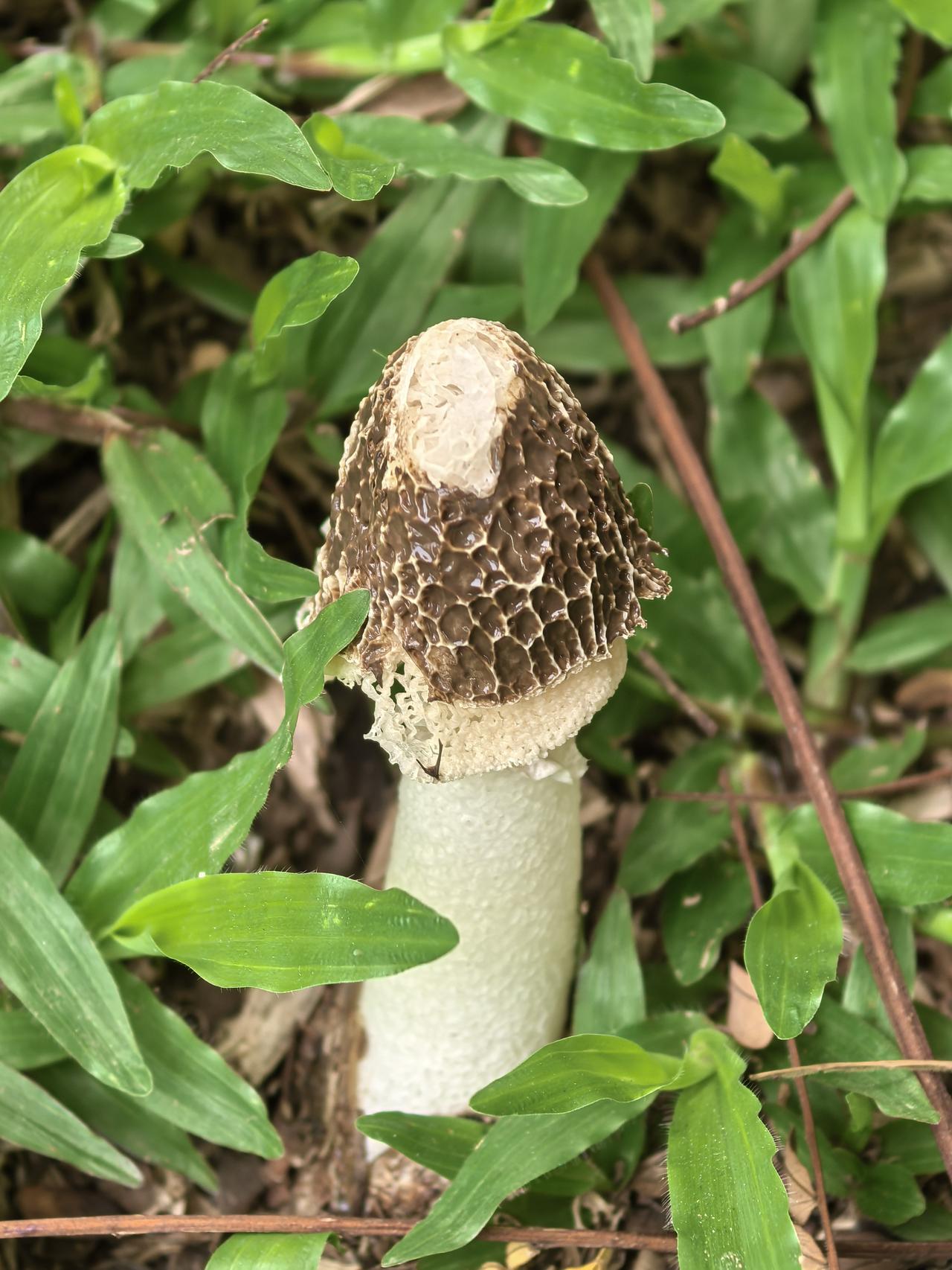 菌盖顶部呈钟形或圆锥形,表面布满深褐色网格状纹理,顶端有白色小孔。