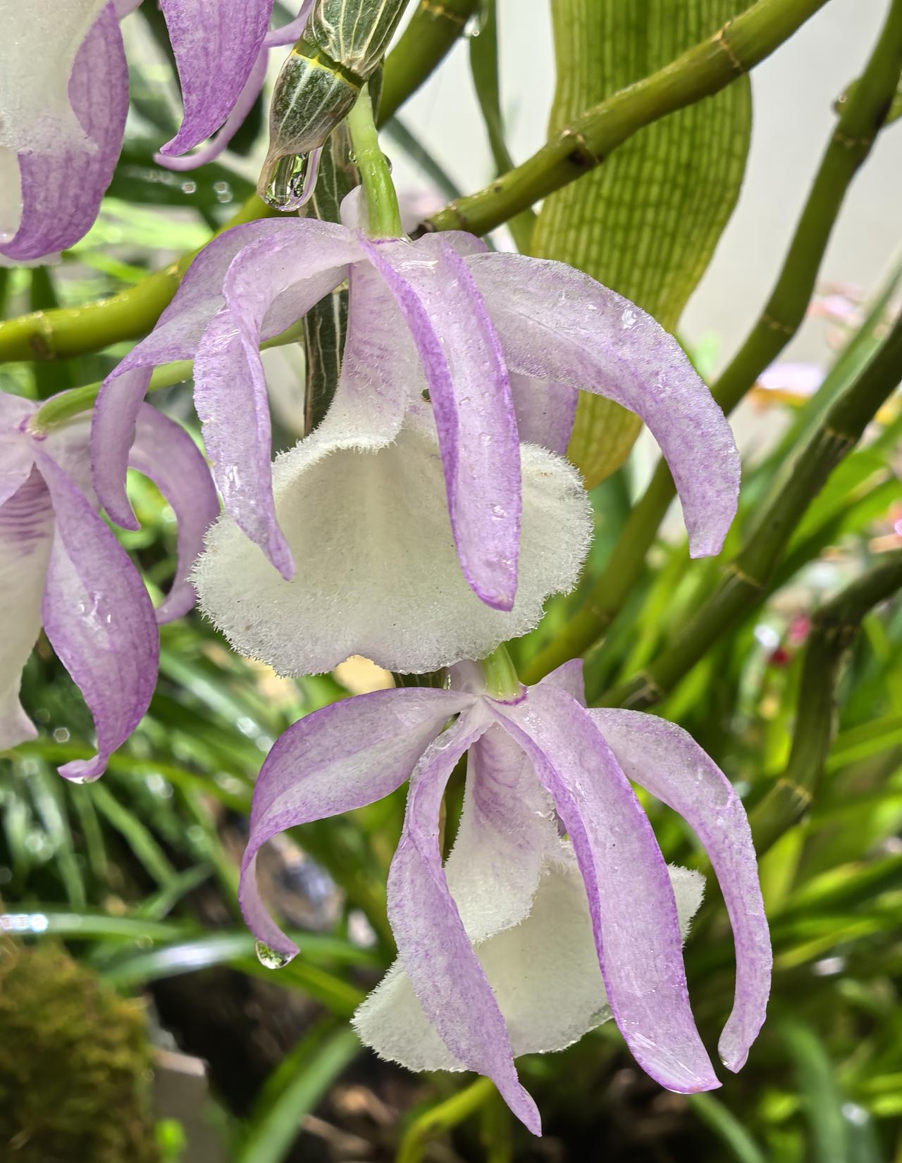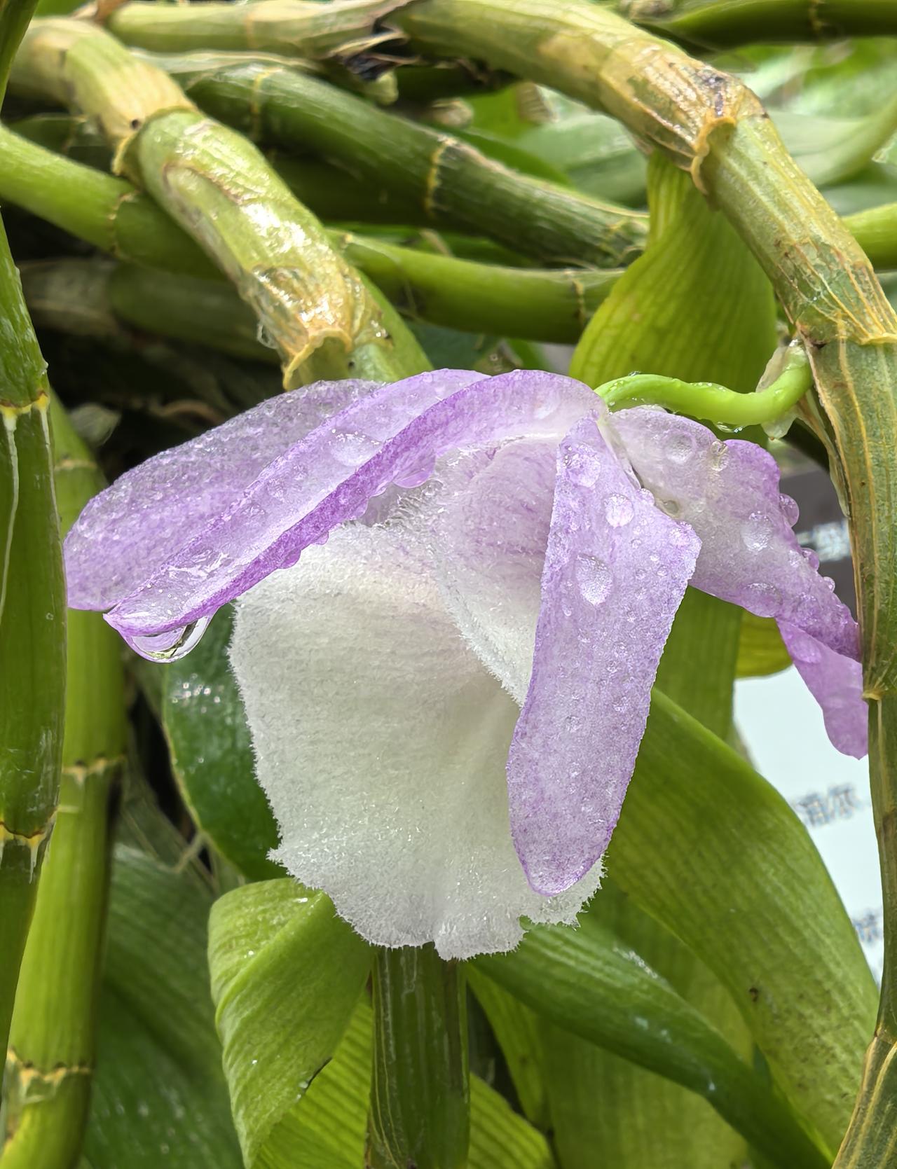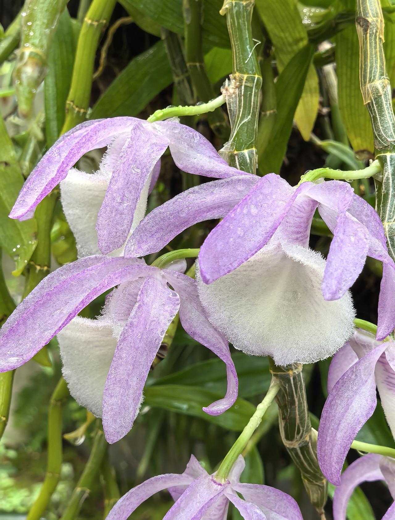 报春石斛的花姿优雅,颇具特色,粉紫花瓣搭配洁白绒感唇瓣,色彩柔和又层次分明,成串垂挂的花型灵动飘逸,无论是盆栽、吊养还是附生在树干、假山,都极具美感,是石斛兰中经典的观赏品种。