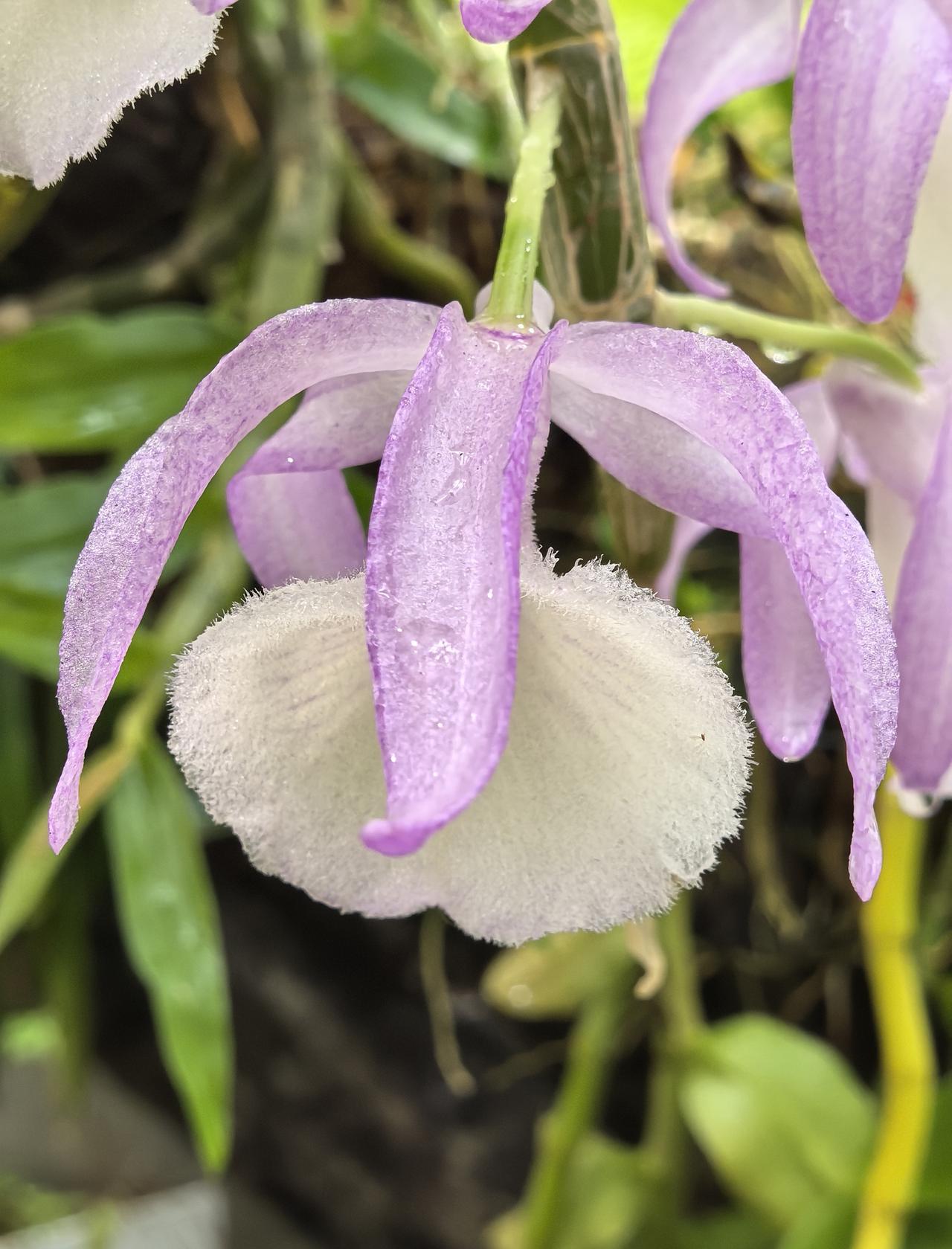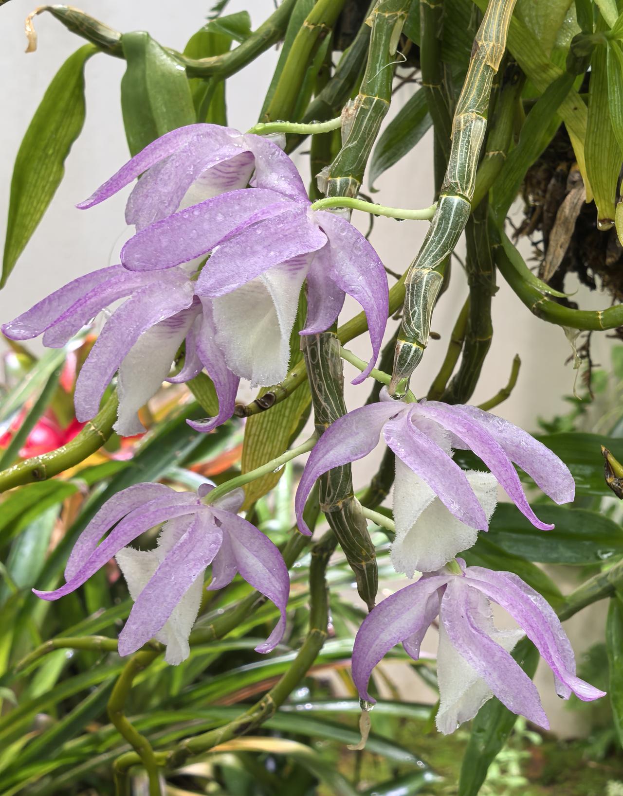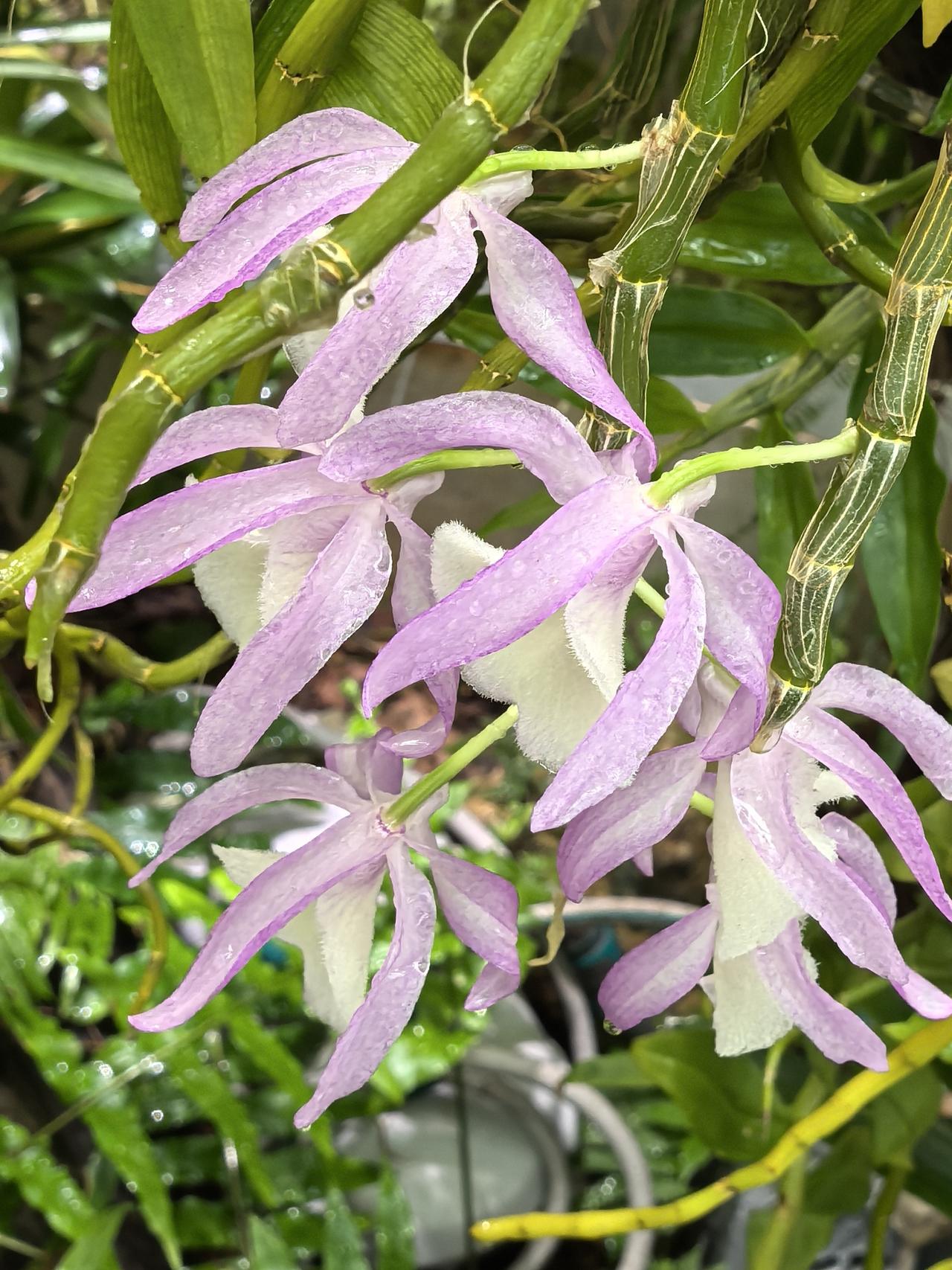 报春石斛的花姿优雅,颇具特色,粉紫花瓣搭配洁白绒感唇瓣,色彩柔和又层次分明,成串垂挂的花型灵动飘逸,无论是盆栽、吊养还是附生在树干、假山,都极具美感,是石斛兰中经典的观赏品种。