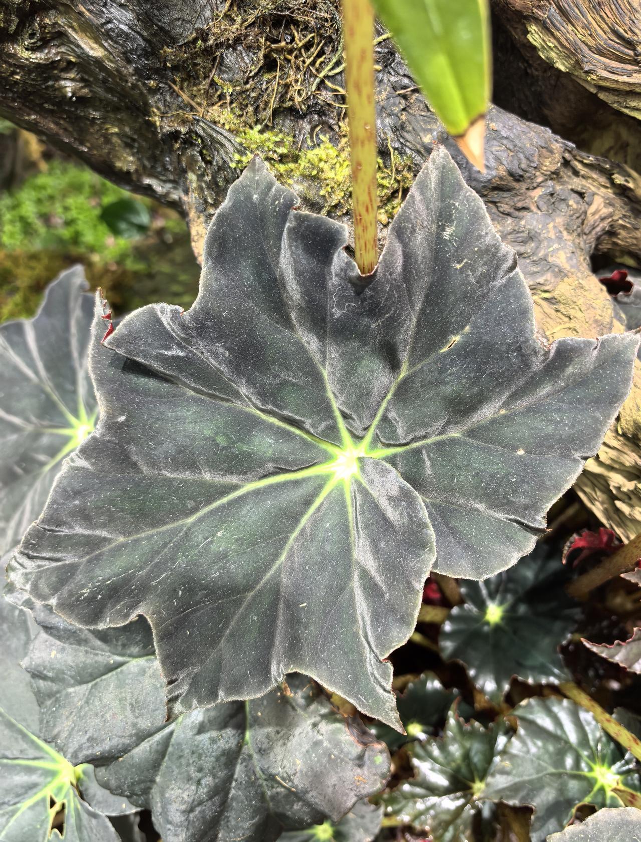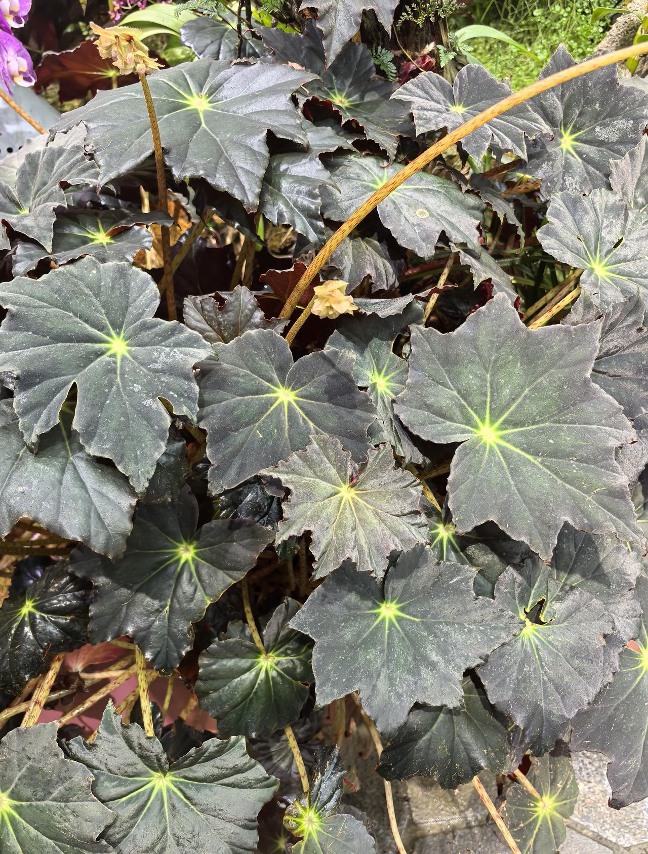 近黑色的叶片在植物界极为罕见,尤其在秋海棠属中属特例,视觉冲击力强,能迅速成为景观焦点。