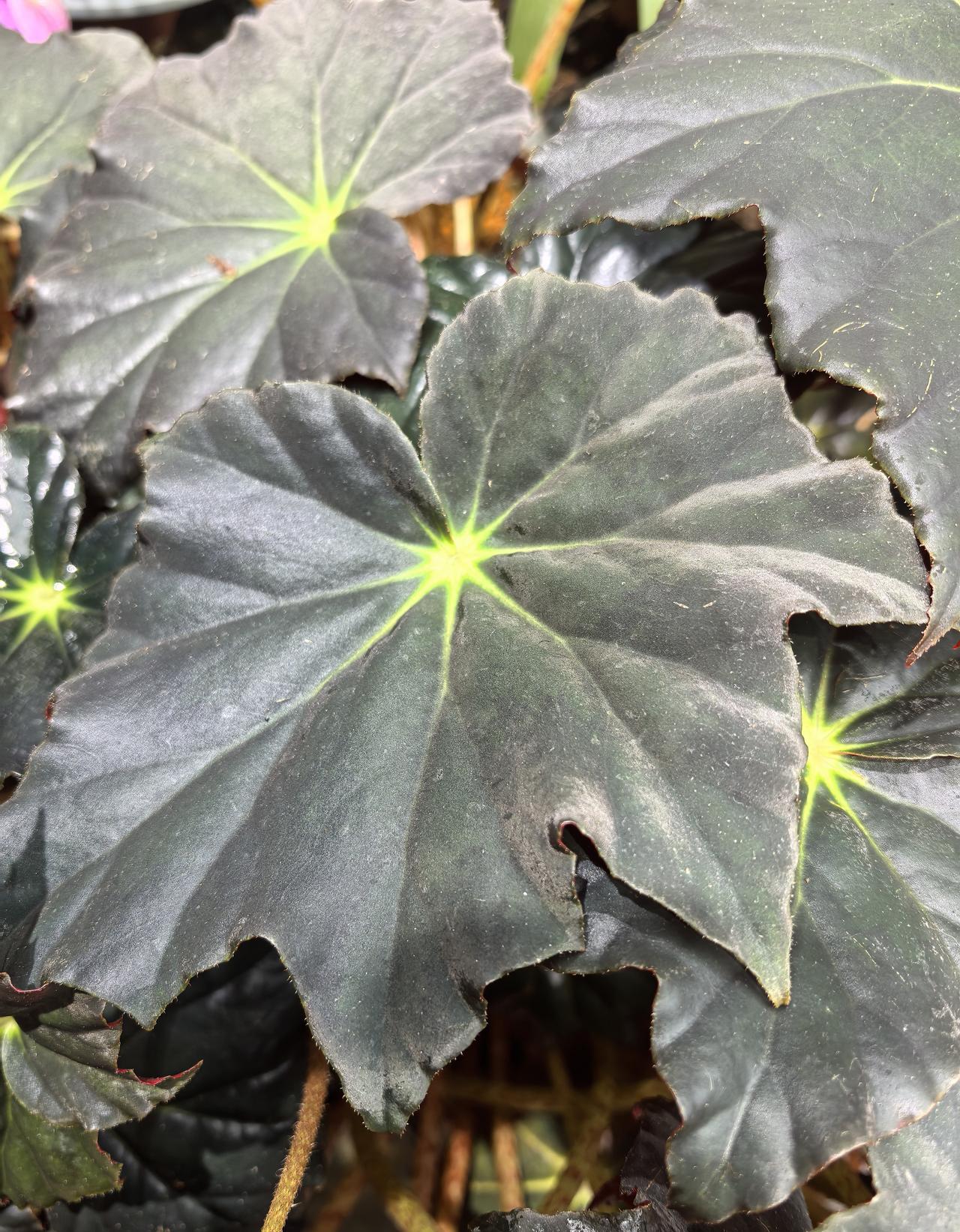 这款秋海棠的叶片为深绿色至墨绿色接近黑色,叶脉有黄绿色晕染;呈放射状分布,在黑色叶底衬托下给人一种奇异的视觉冲击。