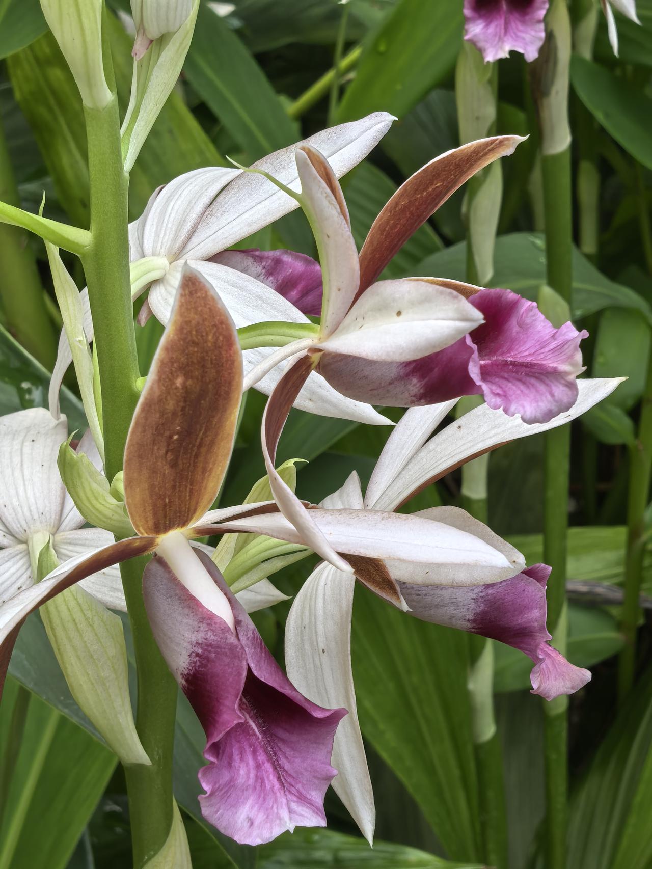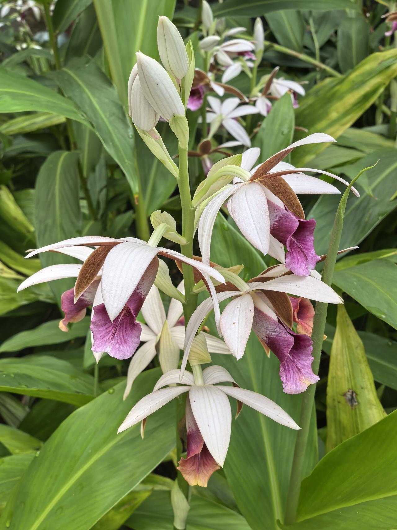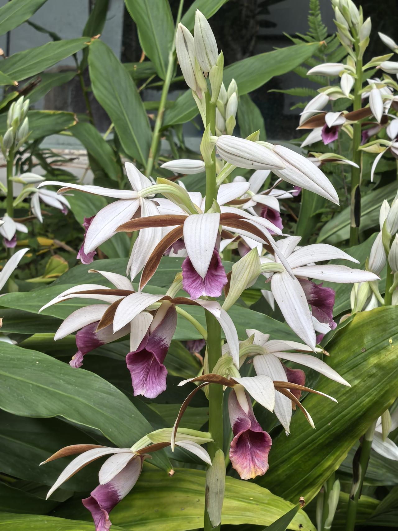 在一串花序上,通常只有最顶端那朵会“偷懒”保持半开状态,形态威武像“雄鸟”;下方5-8朵则尽情舒展,色彩艳丽像“雌鸟”。