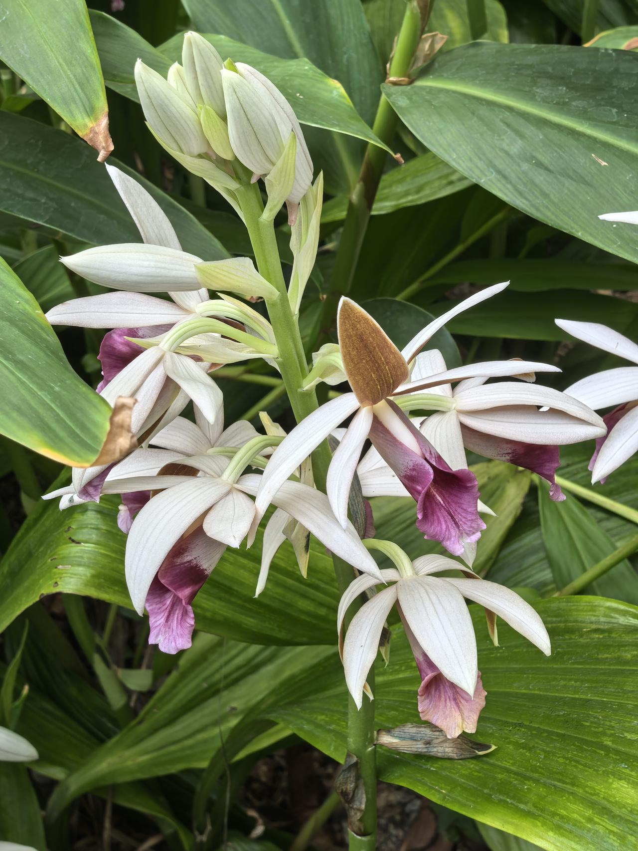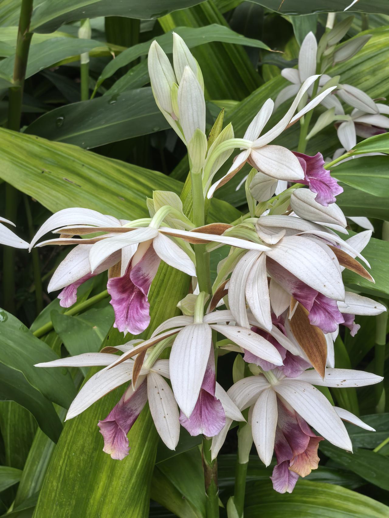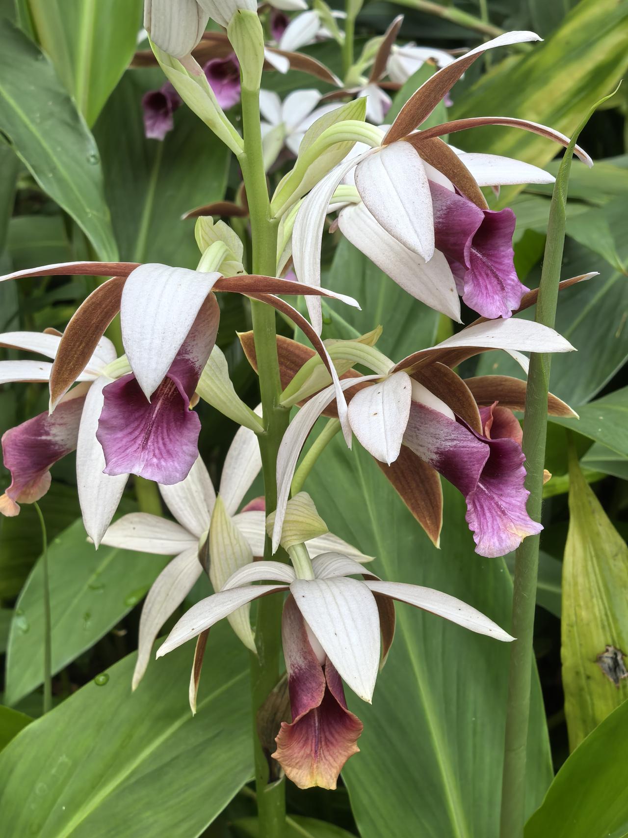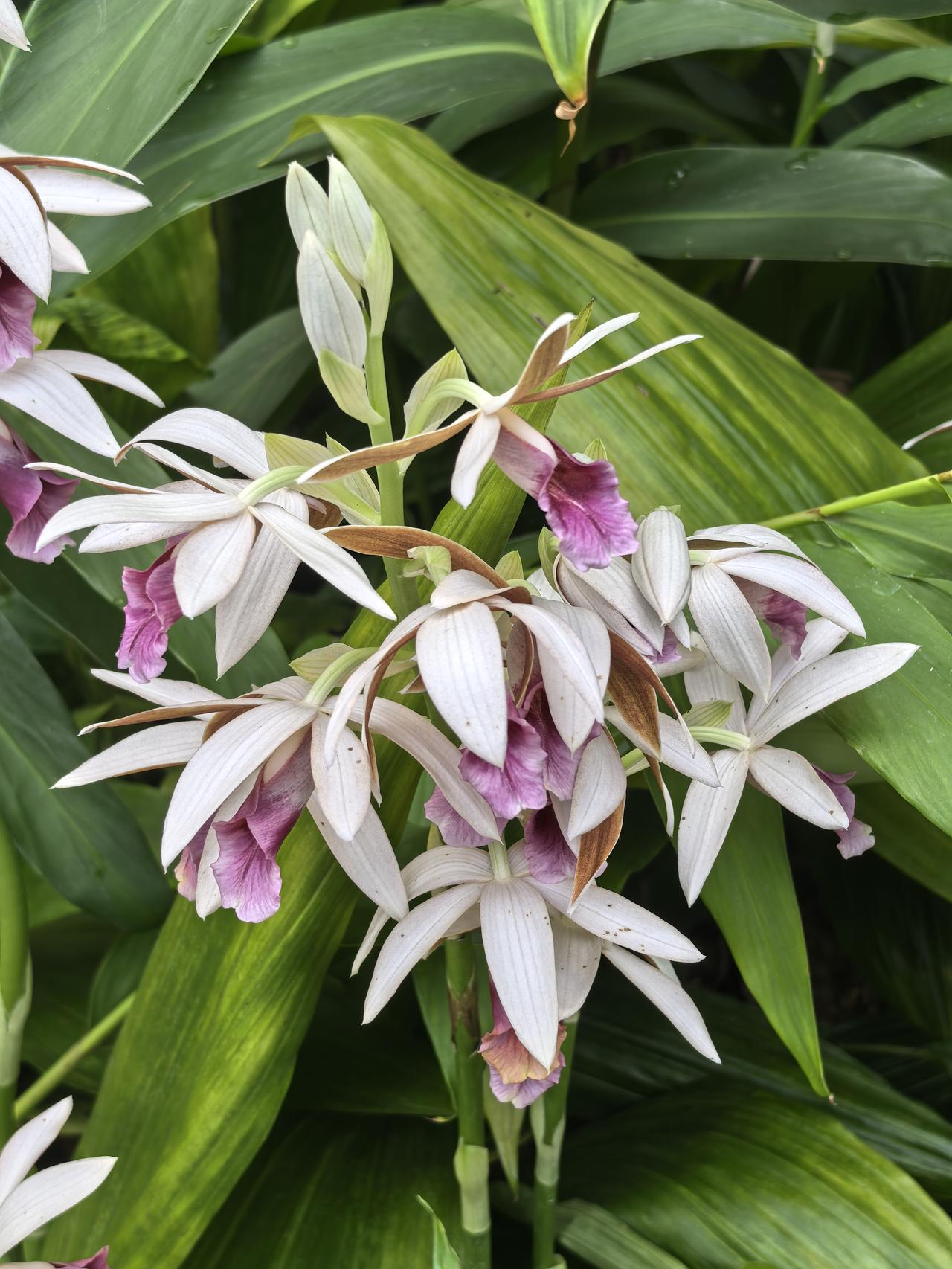 在一串花序上,通常只有最顶端那朵会“偷懒”保持半开状态,形态威武像“雄鸟”;下方5-8朵则尽情舒展,色彩艳丽像“雌鸟”。