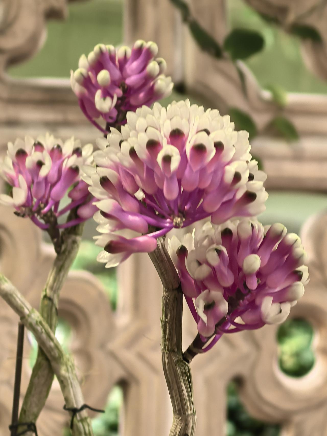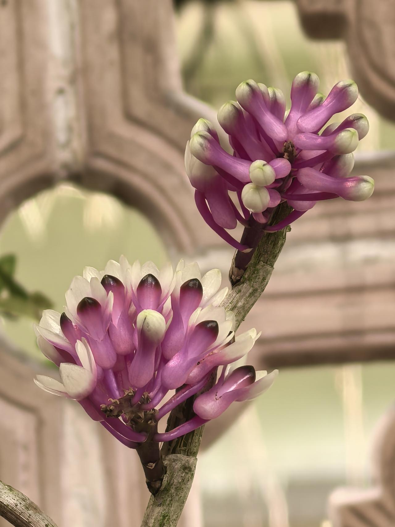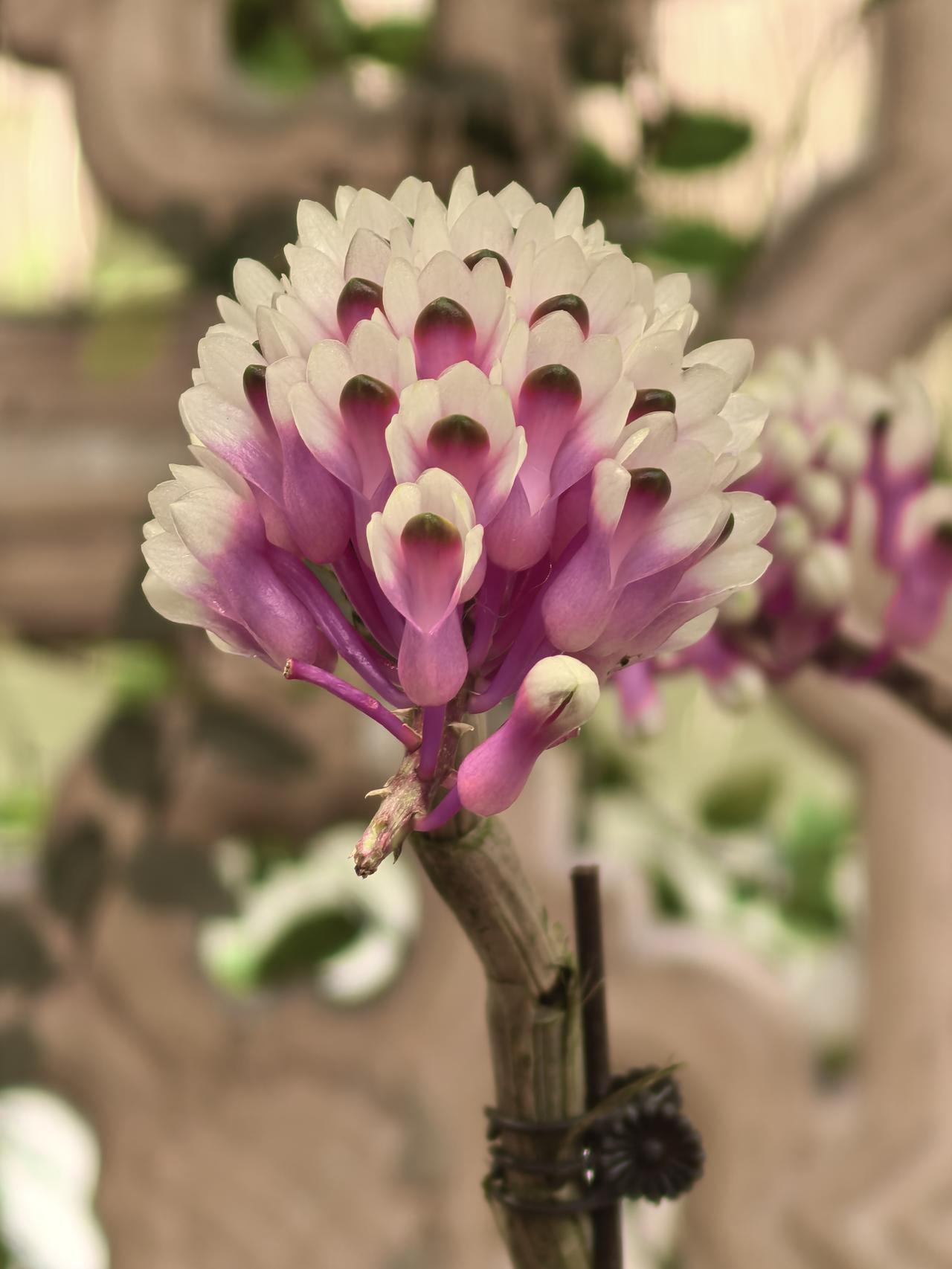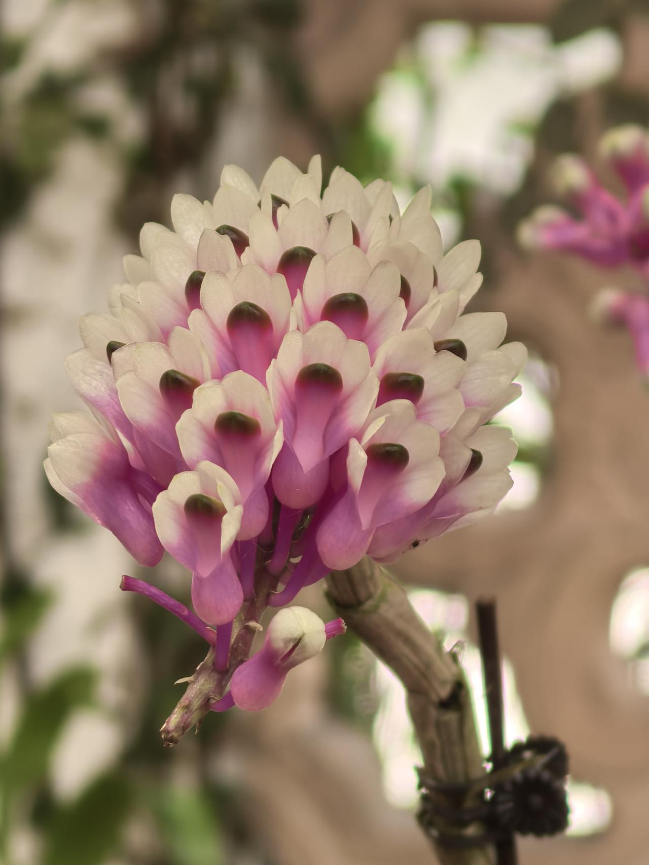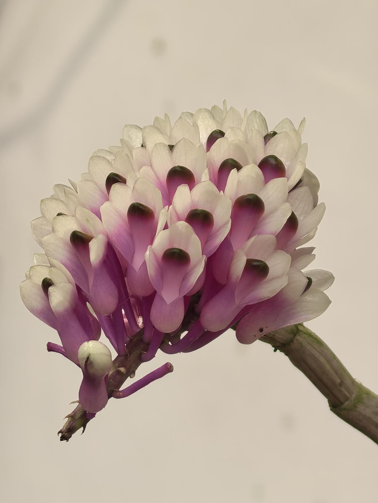 杂交后的品种,既保留了牙刷石斛“成簇排列”的花序形态,又遗传了宝石石斛的渐变色彩和小巧花型,所以被形象地叫做“牙刷X宝石”,是兰展里很受欢迎的“人工混血儿”。