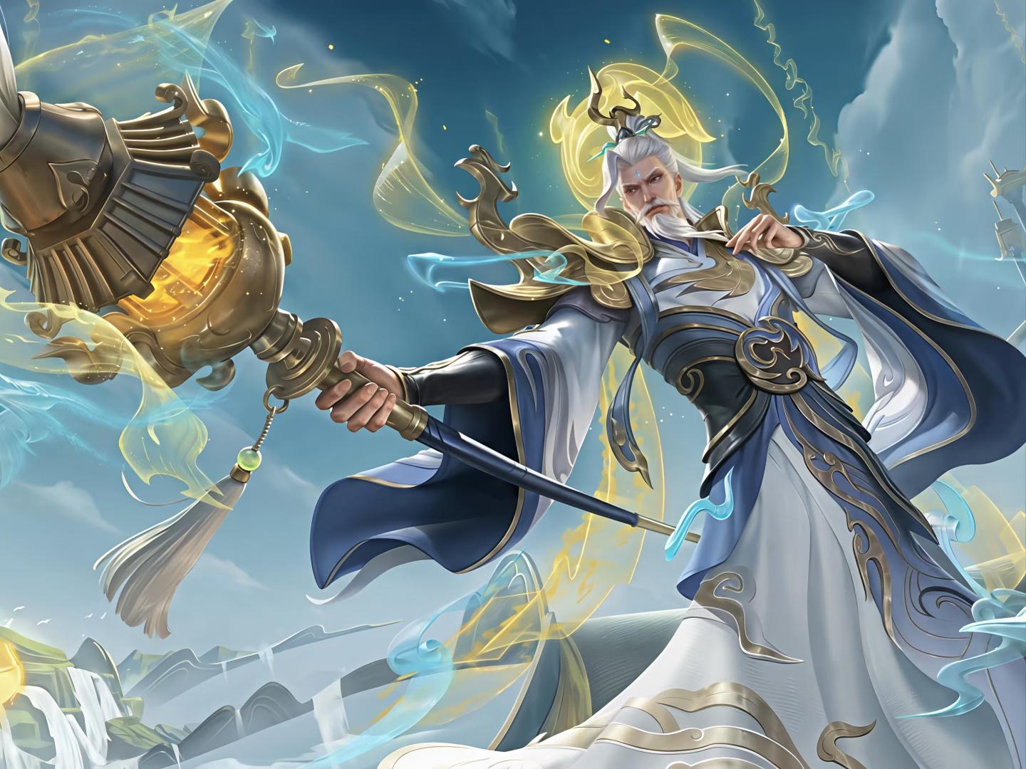 王者荣耀姜子牙新皮肤技能特效王者荣耀 姜子牙弘道录,外形有一种仙风道骨的感觉然后