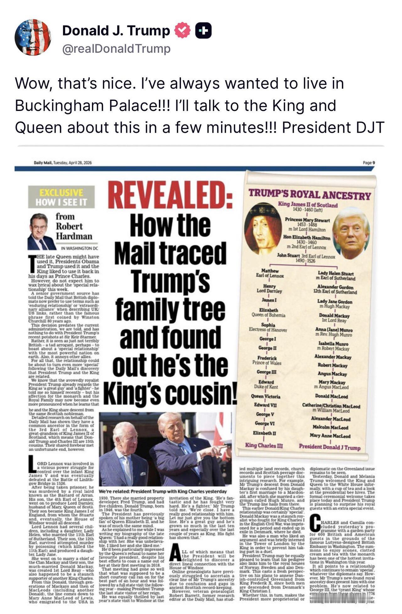 《每日邮报》最近那叫一个闲不住,把苏格兰的历史档案翻了个底朝天,顺着族谱一路往上扒,竟然挖出了个惊天大瓜:美国前总统特朗普,居然和英国国王查尔斯三世是第15代远房表兄弟!