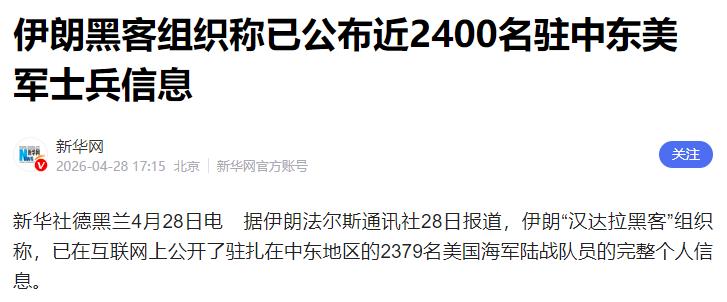 当地时间4月28日,伊朗"汉达拉黑客"组织发布声明称,这只是对美国的一次小小警告,美军指挥官们引以为傲的安全防护不过是自欺欺人的幻觉。