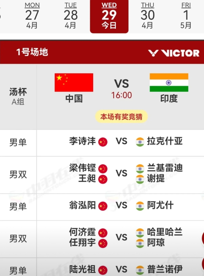 汤姆斯杯小组赛最后一轮,国羽很有可能会全军覆没,唯一有希望获胜的就是何济霆/任翔宇了,李诗沣打拉克什亚虽然整体交手记录占优,但是从近期双方的状态来看,李诗沣处于下风了,梁王组合、翁泓阳和陆光祖都是稳定性一般的选手,加上印度队派出的参赛阵容实力都很强,基本上赢球的希望不大,除了何济霆/任翔宇的二双。