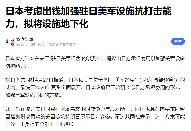 日本为驻日美军支付的“保护费”可能又要涨价了,据日本共同社4月27日报道,日本和美国关于“驻日美军经费”的谈判,于2026年夏季全面展开,现在日本政府已开始研究以日方承担费用的形式,加强美军设施防护的方案。
