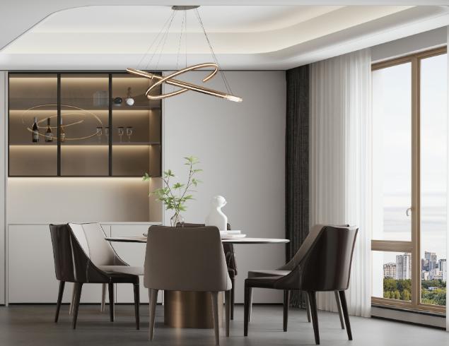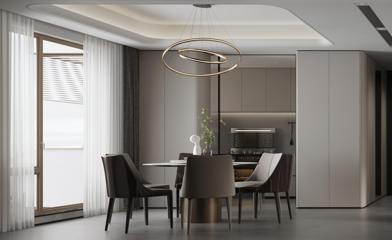 餐厅和客厅没有明显的分区,也给未来增添了更多可能性。头顶是灿金色的环形吊灯,依旧是极简风。内侧是厨房,尽量都是采用内嵌式的设计,虽然前期需要良好尺寸,预留好需要的空间,但是后期只要打理得当,是真的非常好看。