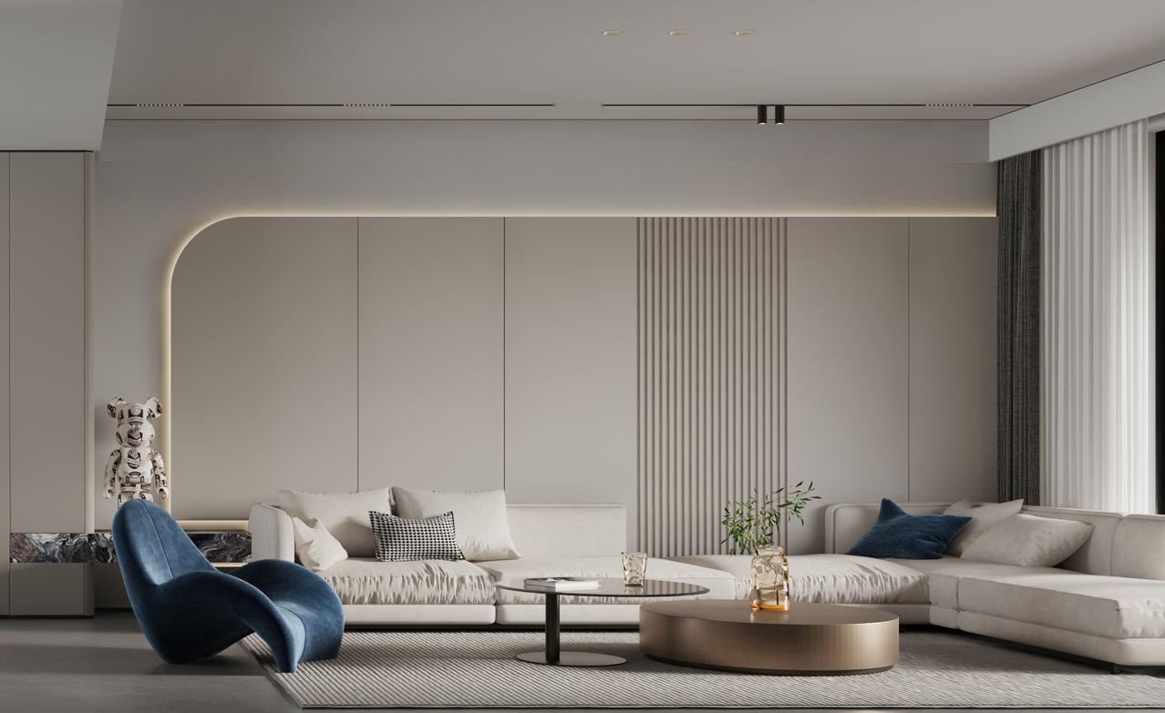 这间屋子的墙面采用分体式设计,双层墙面之间镶嵌了一圈灯带,天花板更是无主灯的设计,只有几个滑轨探照灯在那摆放着,虽然室内的照明效果不太好,但是完全不影响室外的采光啊。落地窗让更多的接纳室外的阳光,让室内看起来宽敞明亮。