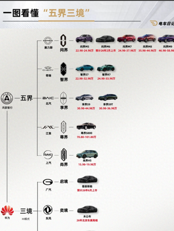 华为与车企的合作分为鸿蒙智行“五界”与HI模式“三境”两大体系,命名统一采用“界/境”字后缀,形成了辨识度极强的家族化命名矩阵。