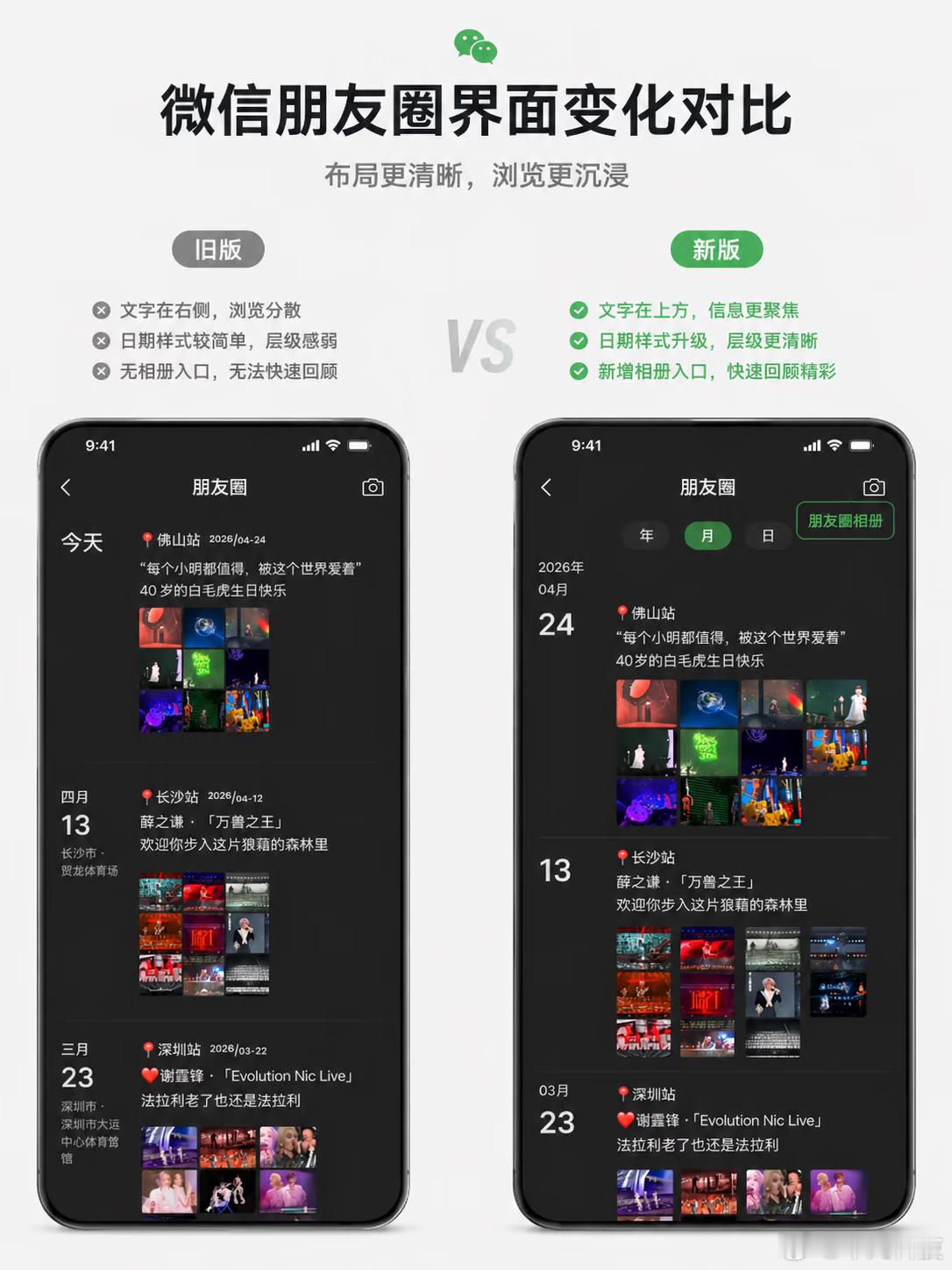 1️⃣✅文字从“右侧”变成“图片上方” ,阅读顺序更自然2️⃣✅日期从简单时间 变成“年/月/日”层级,更像时间轴3️⃣✅新增「朋友圈相册」入口,可以按时间目前改版主要针对iOS用户,安卓用户可以再等等,说不定很快就会同步更新。你们觉得这次朋友圈的改版怎么样?评论区聊聊❤️