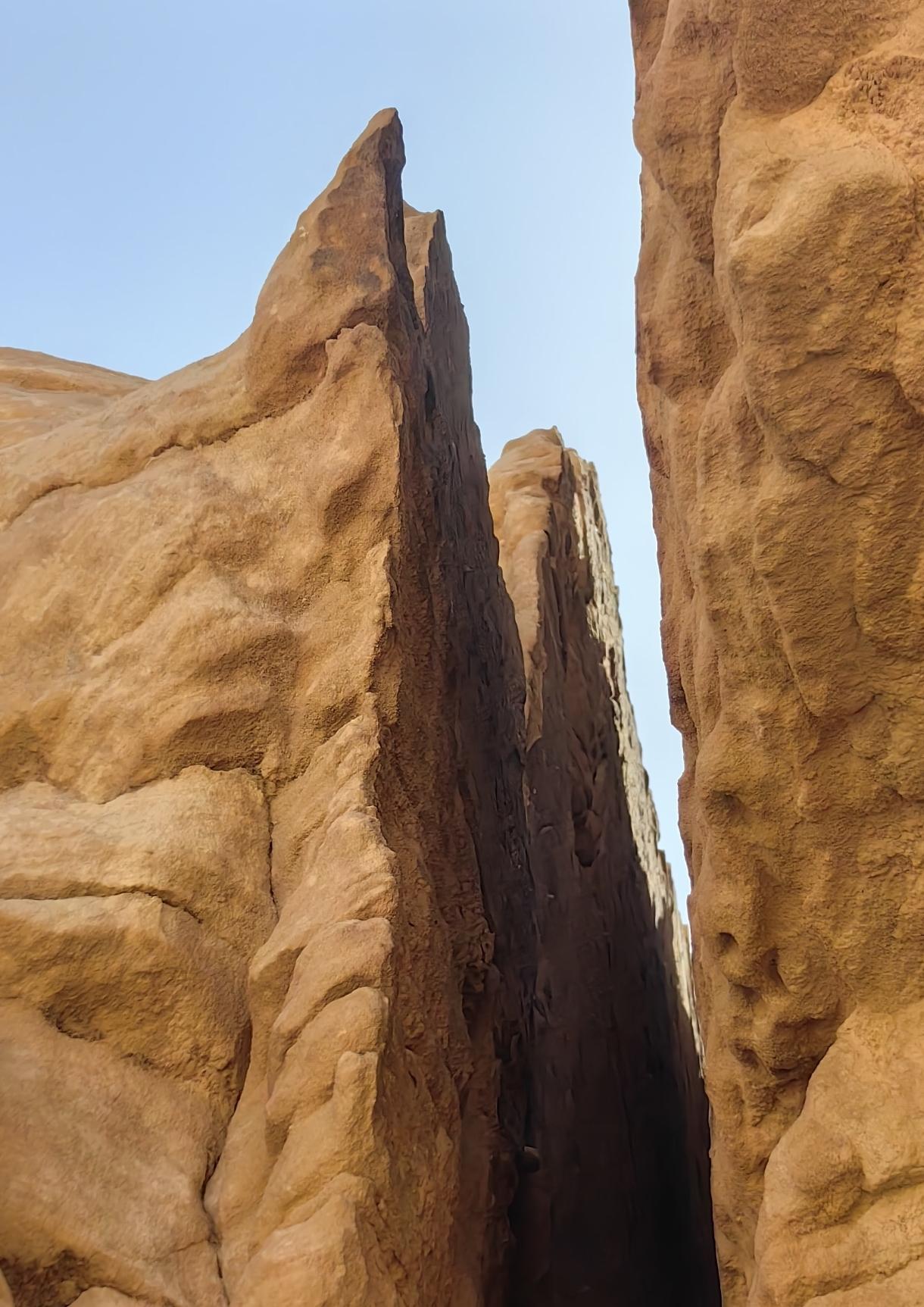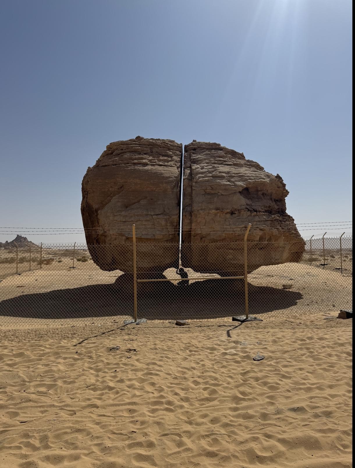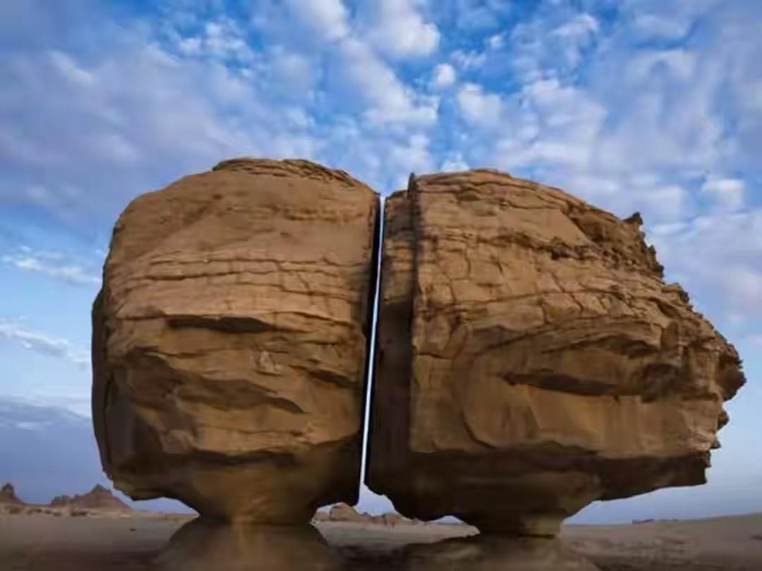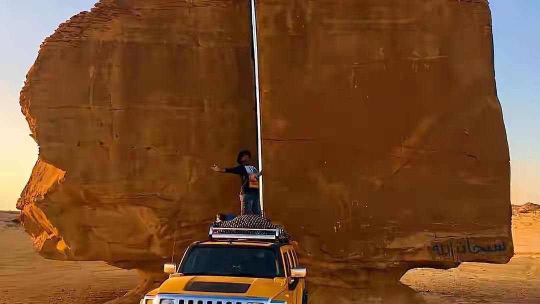 在沙特泰马绿洲沙漠里,杵着一块近6米高的砂岩巨石。它像是被一把巨大的激光剑,从上到下精准劈开,裂成两半!