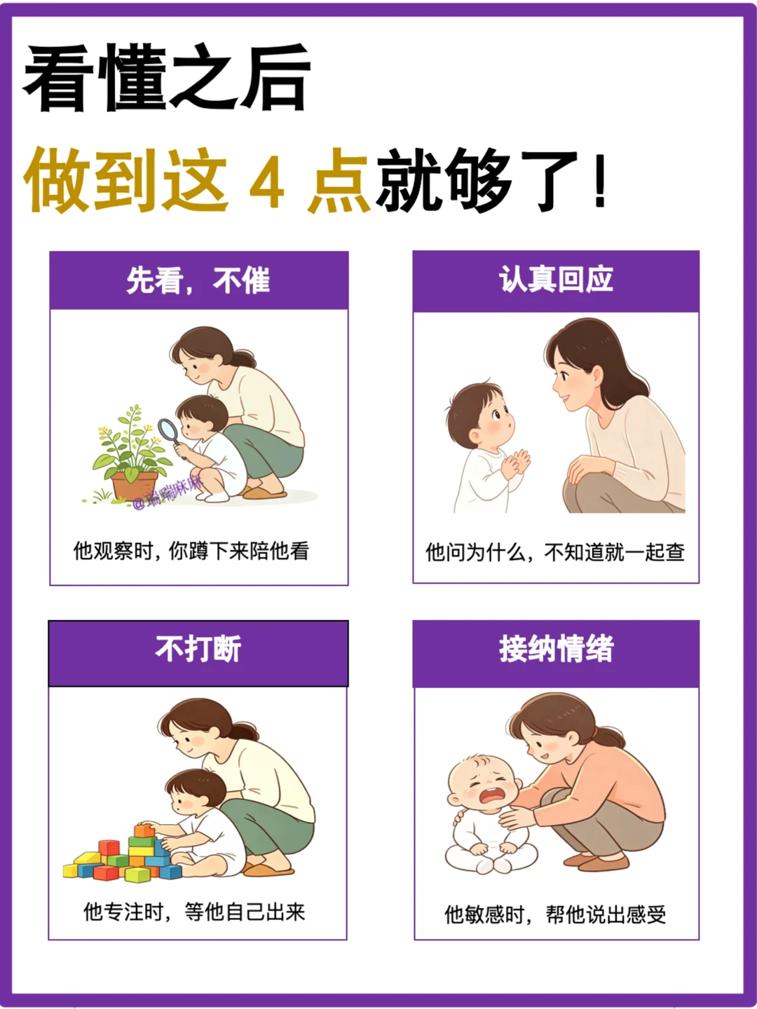 4、孩子敏感、哭闹时,先帮他说出感受、接住情绪,而不是急着说教或制止。